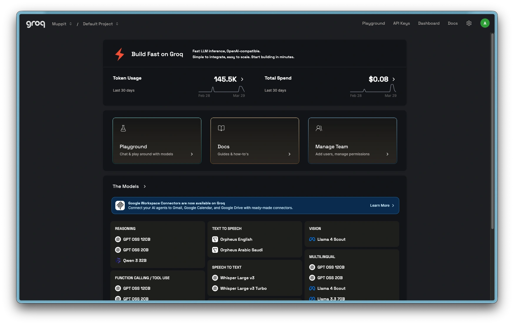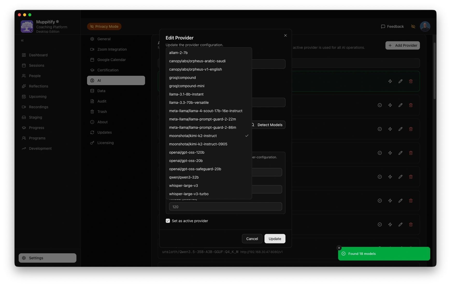 Groq is a cloud AI provider known for extremely fast inference speeds. Rather than training its own models, Groq runs popular open-source models (Llama, Mixtral, Qwen) on custom hardware designed for speed. The coaching platform can connect to Groq's API to analyse your coaching transcripts and generate ICF competency assessments.