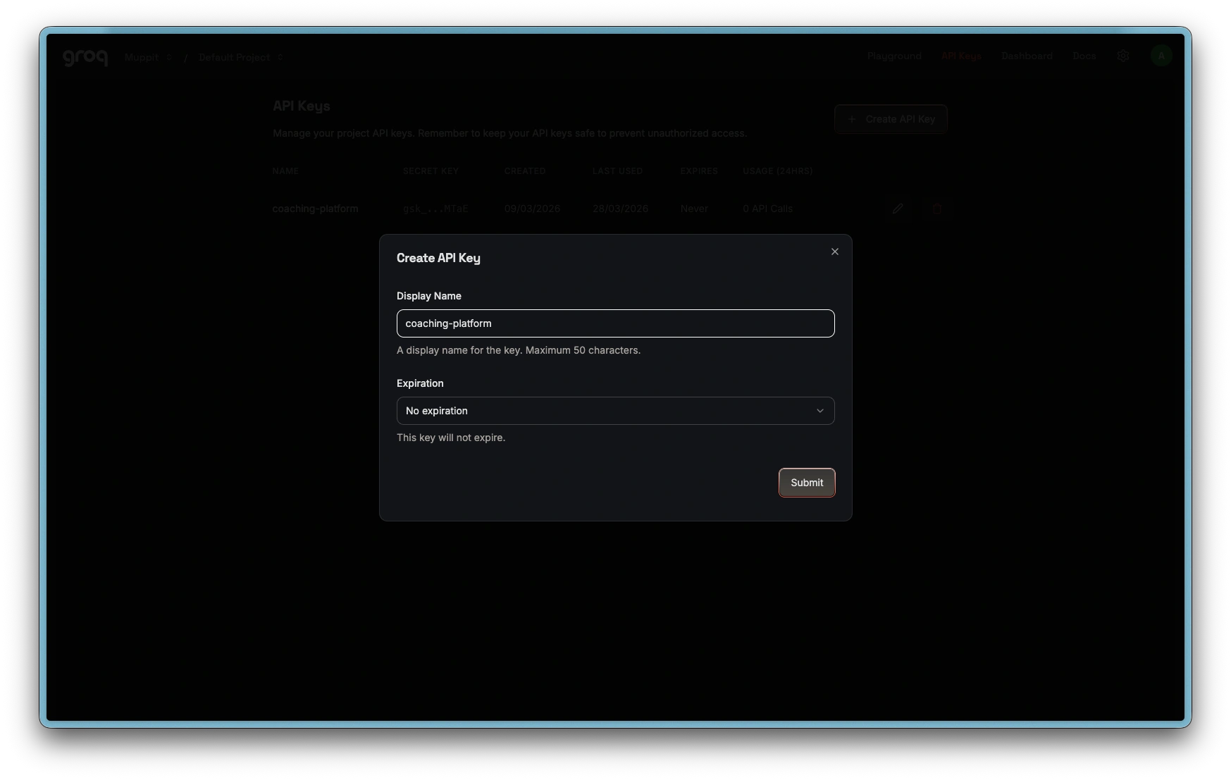 Verify the key is correct. Go to API Keys in the Groq console and check that the key exists and has not been revoked. If in doubt, create a new key and update it in the coaching platform.