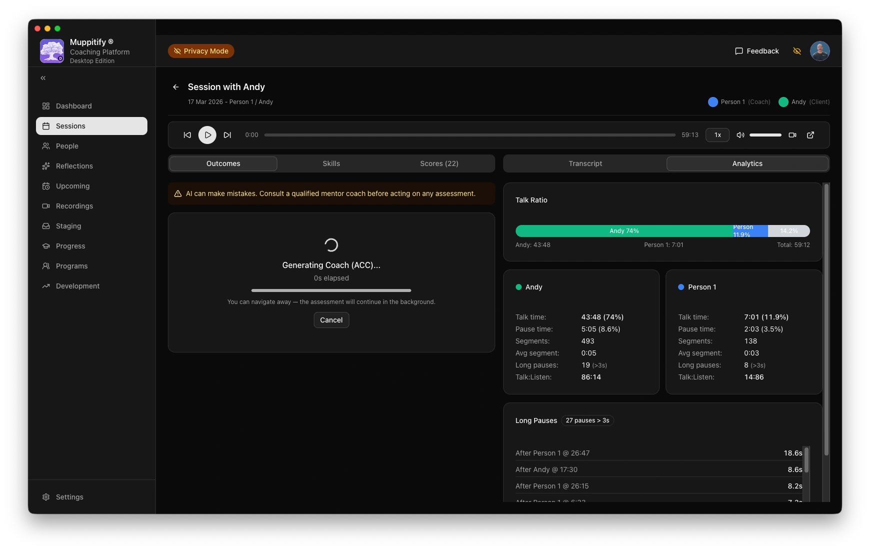 To test the connection, open any session with a recording and transcript, then click Generate AI Assessment.