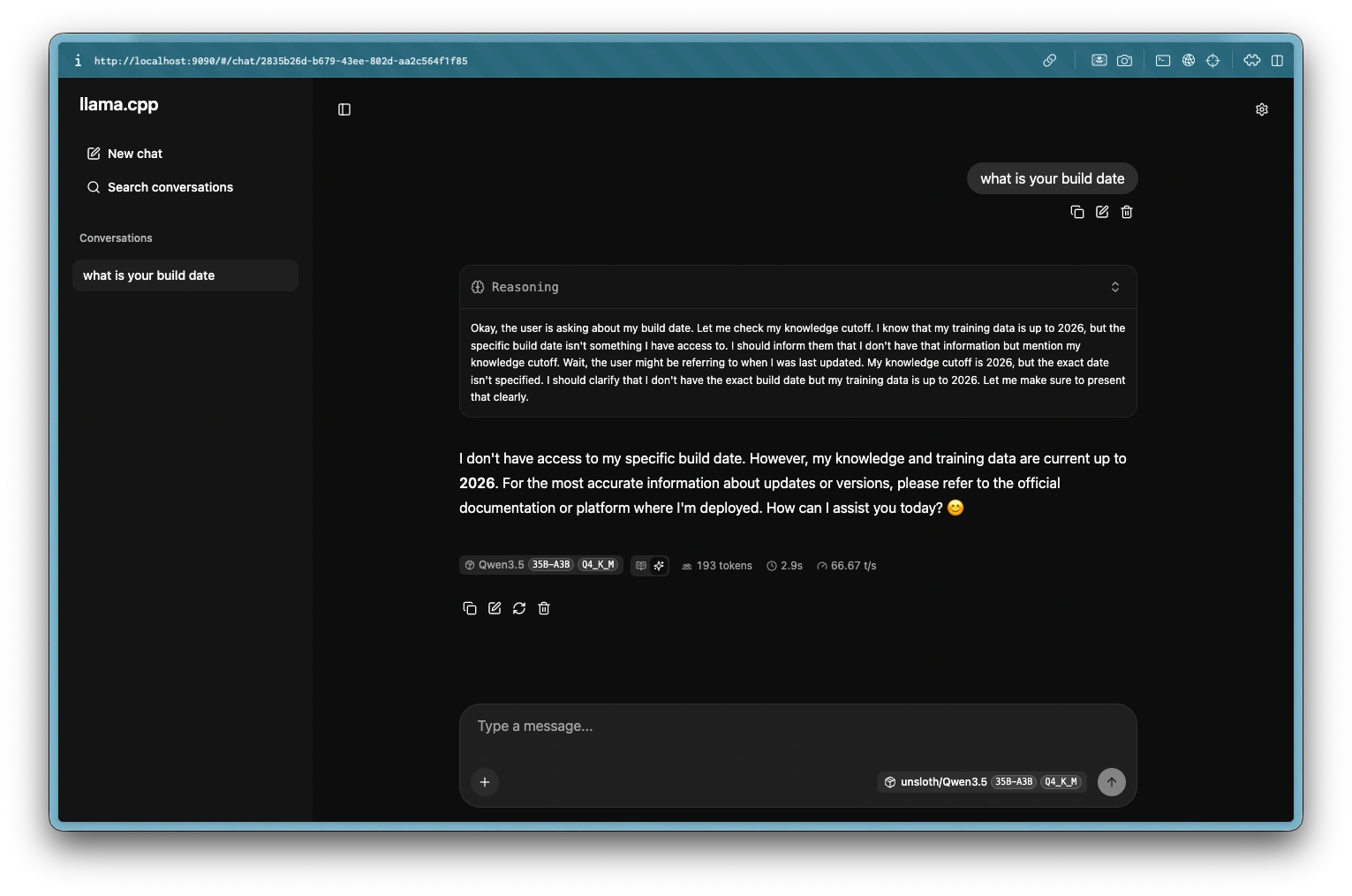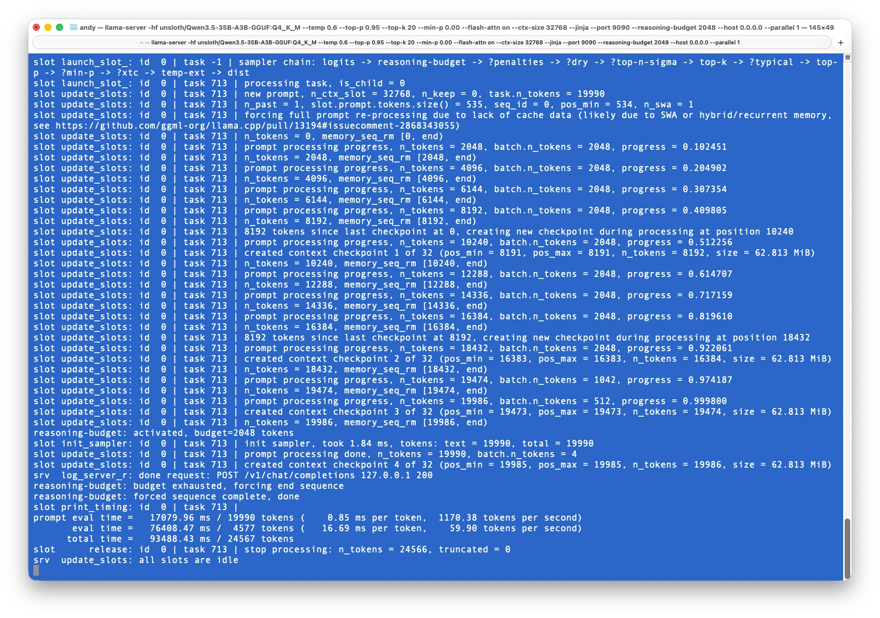 --flash-attnnow requires an explicit value:on,off, orauto. Older tutorials may show it as a bare flag without a value, which no longer works.--reasoning-budgetwith positive values (e.g. 2048) requires build 8300+ (March 2026). Homebrew and winget packages include this as of mid-March 2026. Runllama-server --versionto check your build number.- Confirmed working on build 8390 with Qwen3.5-35B-A3B on Apple M2 Ultra (173 GB unified memory).