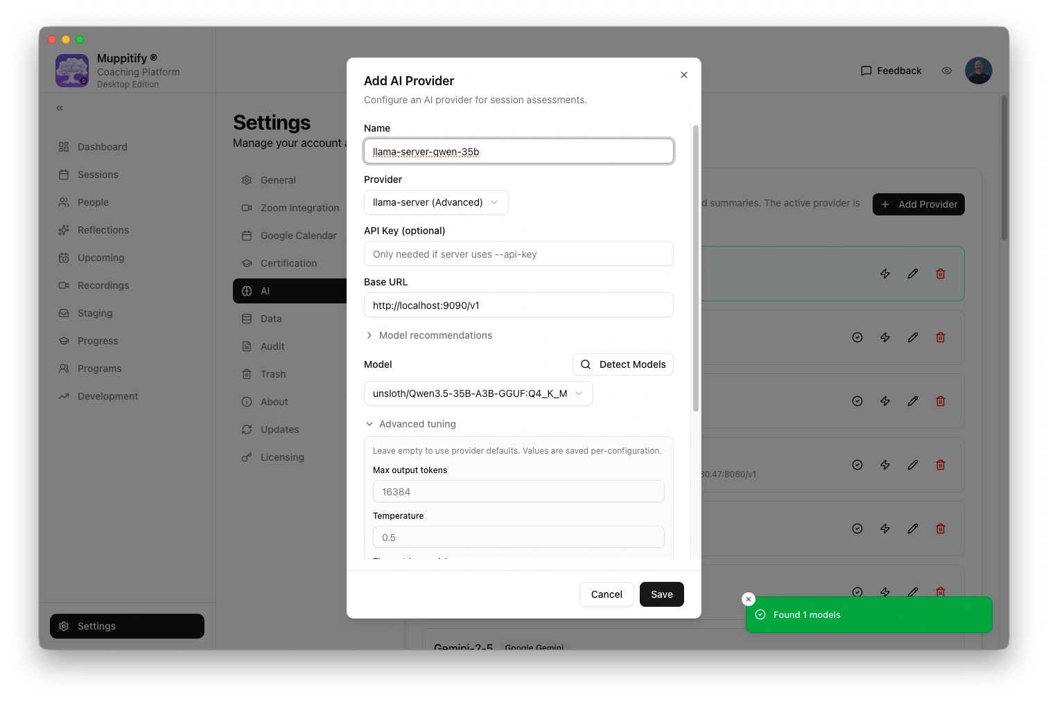 | Desktop (same Mac) | http://localhost:9090/v1 | llama-server and the coaching platform run on the same machine |