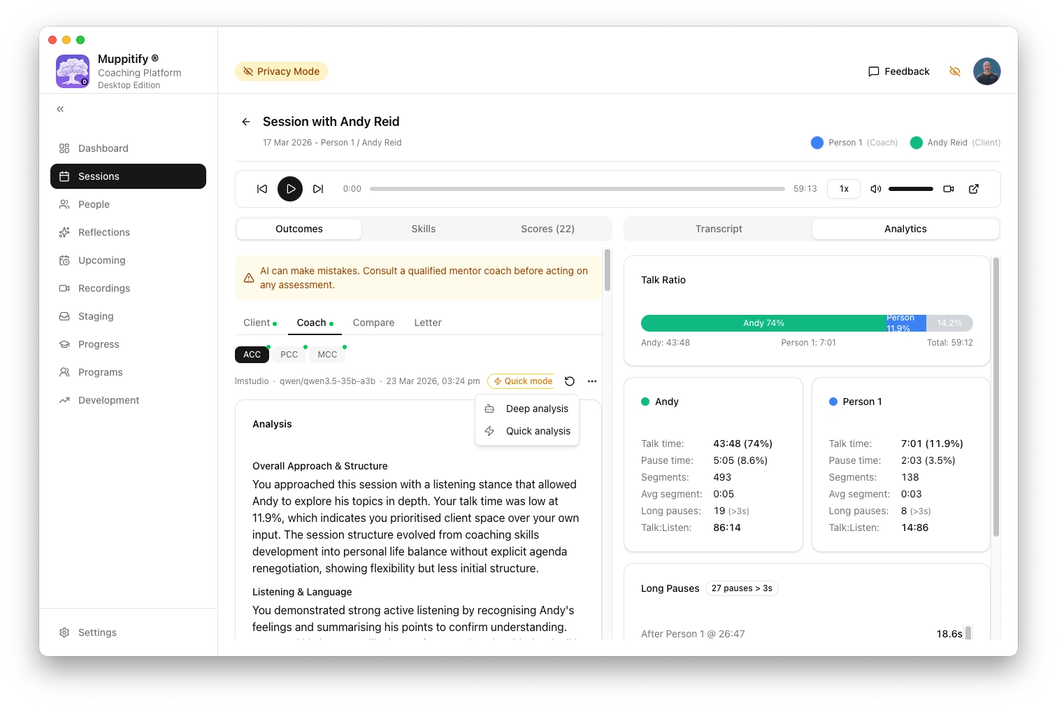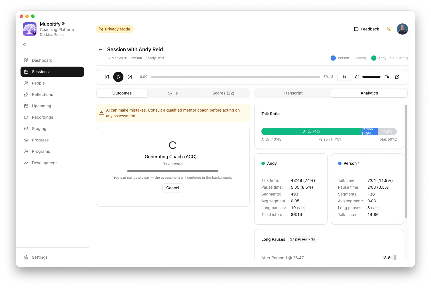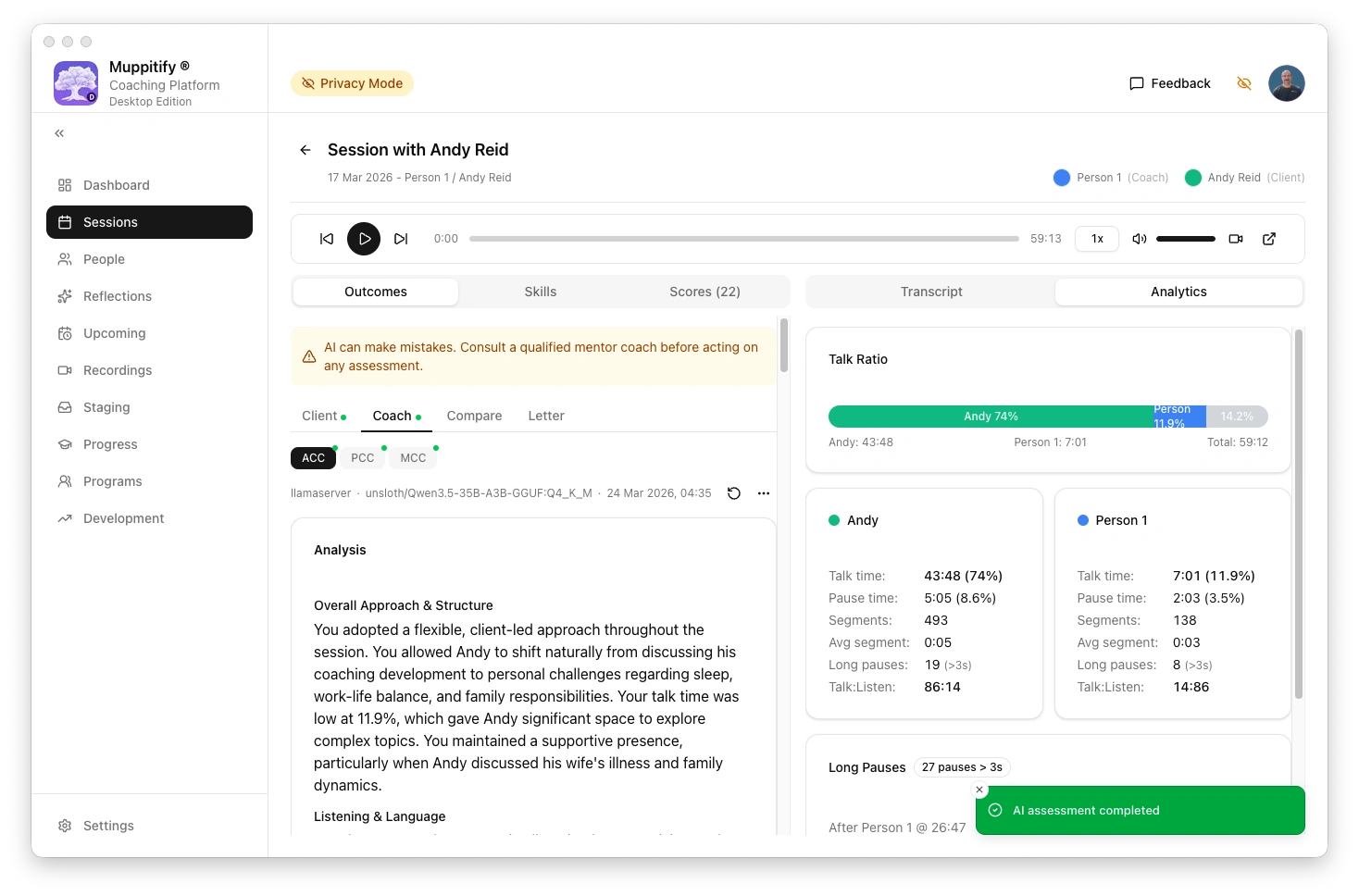 To test the connection, open any session with a recording and transcript, then click Generate AI Assessment.