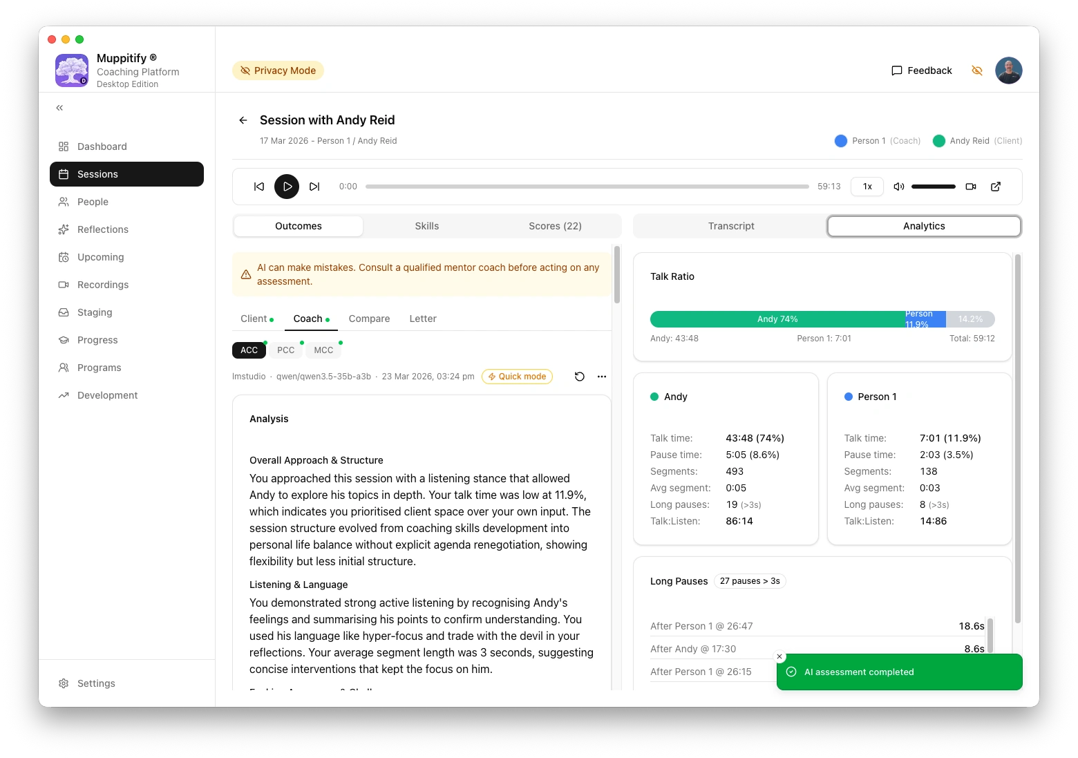 To test the connection, open any session with a recording and transcript, then click Generate AI Assessment.