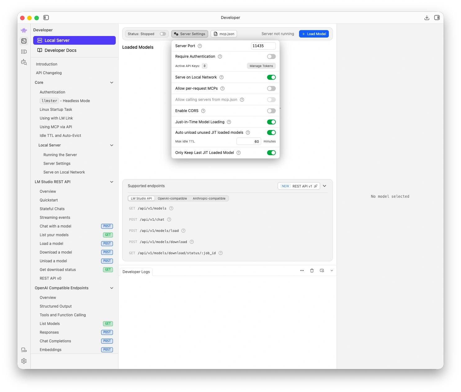 The server runs at http://localhost:1234/v1 by default. You should see a green status indicator when the server is running.