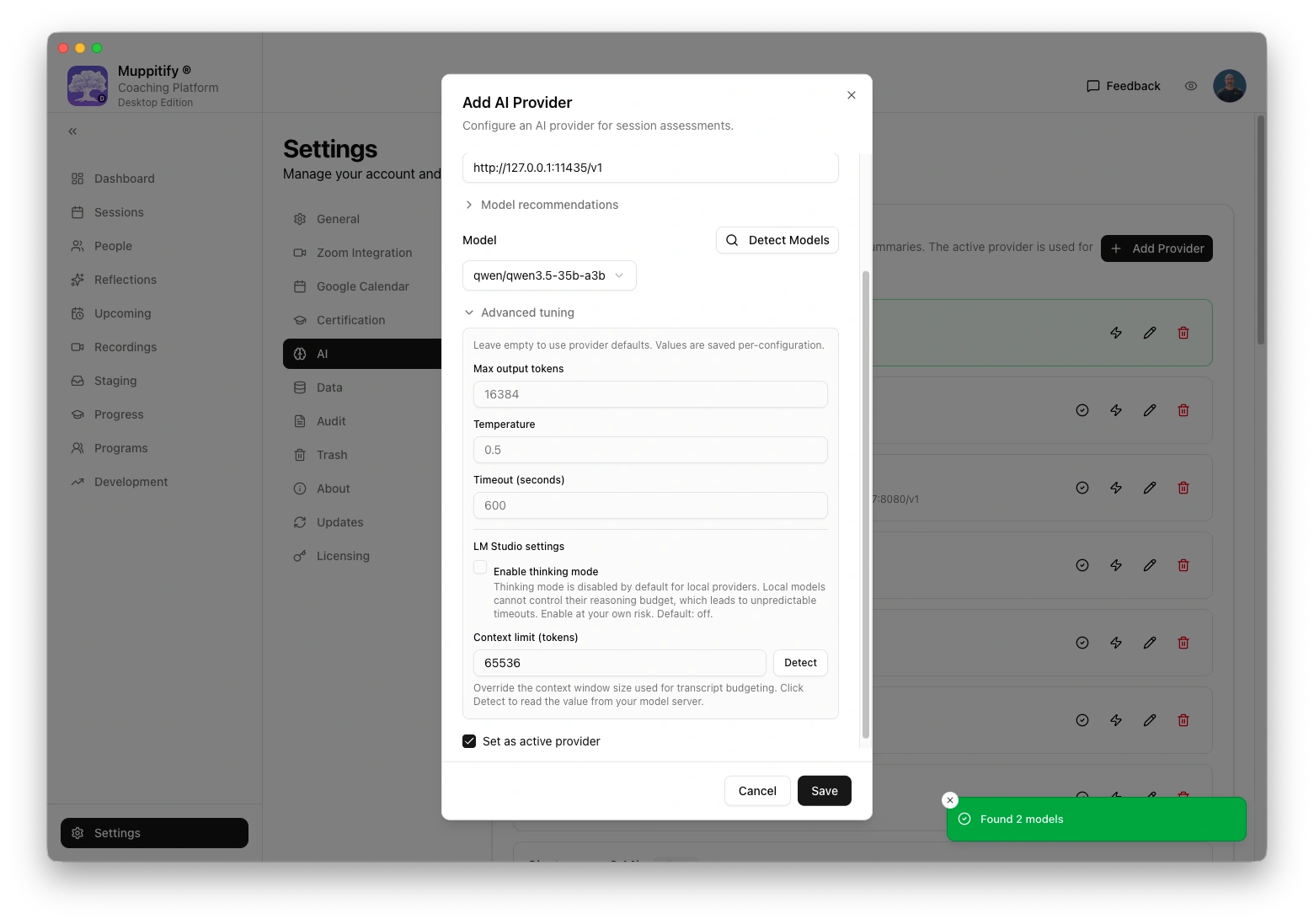 The coaching platform connects to LM Studio's built-in local server. No API key is needed.