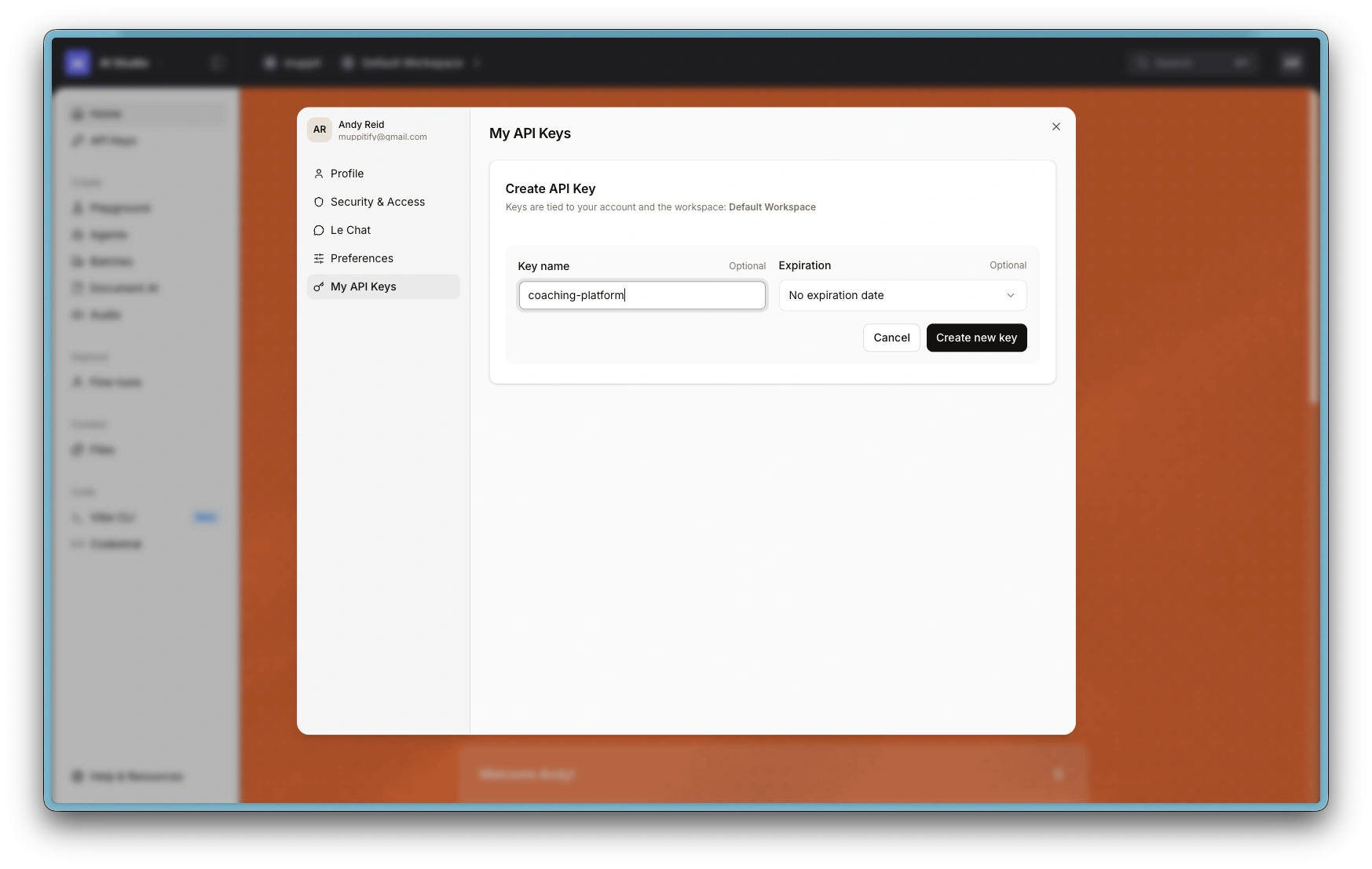 - In the Mistral console, go to API Keys in the left sidebar
