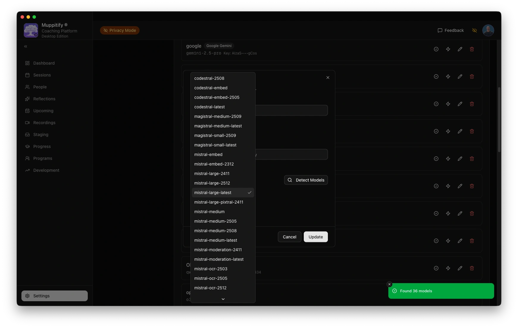 Mistral is a European AI provider based in Paris. The coaching platform can connect to Mistral's cloud API to analyse your coaching transcripts and generate ICF competency assessments. You need a Mistral account and an API key. Usage is pay-as-you-go.