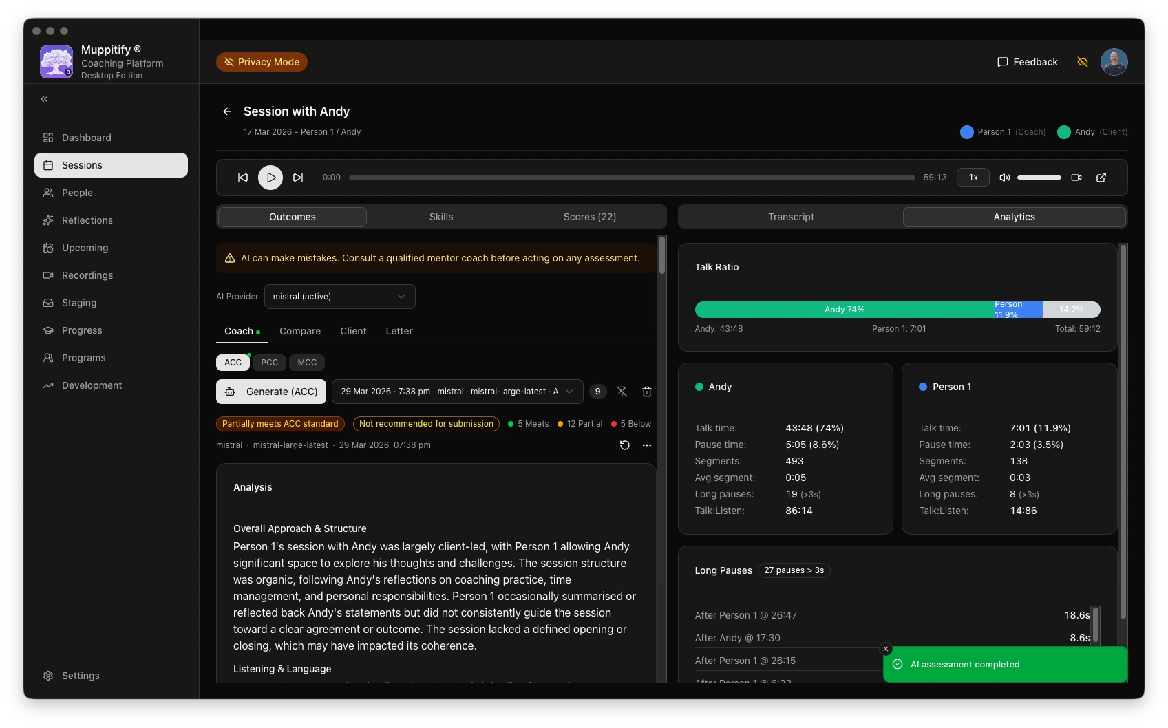 To test the connection, open any session with a recording and transcript, then click Generate AI Assessment.