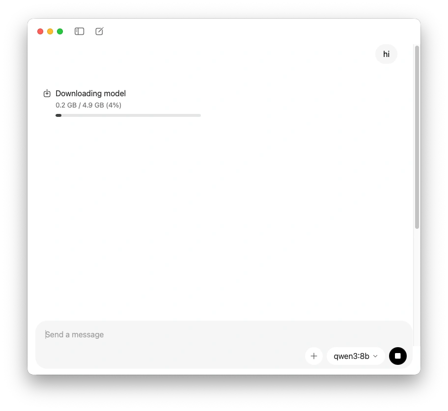 After selecting a model, type any message (even just "hi") and press Enter. Ollama automatically downloads the model before responding. This can take a few minutes depending on the model size and your internet speed. You only need to do this once per model.