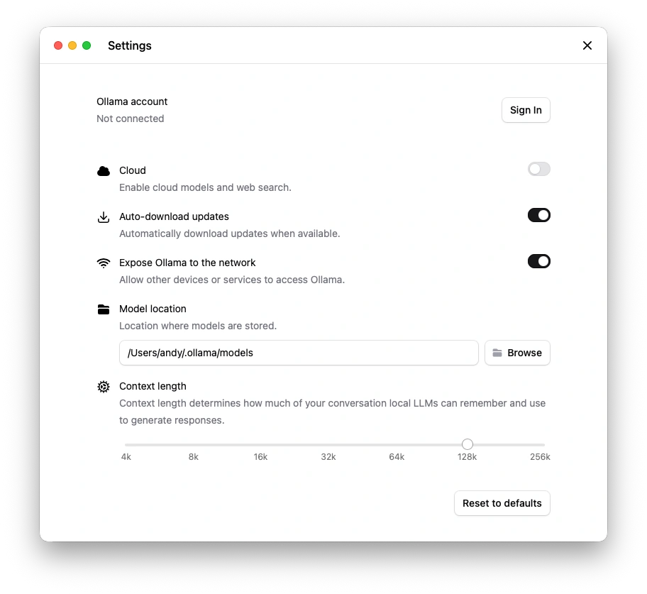 Ollama's Settings page has a "Context length" slider. You can leave this at the default. The coaching platform automatically manages the context window based on your system memory.