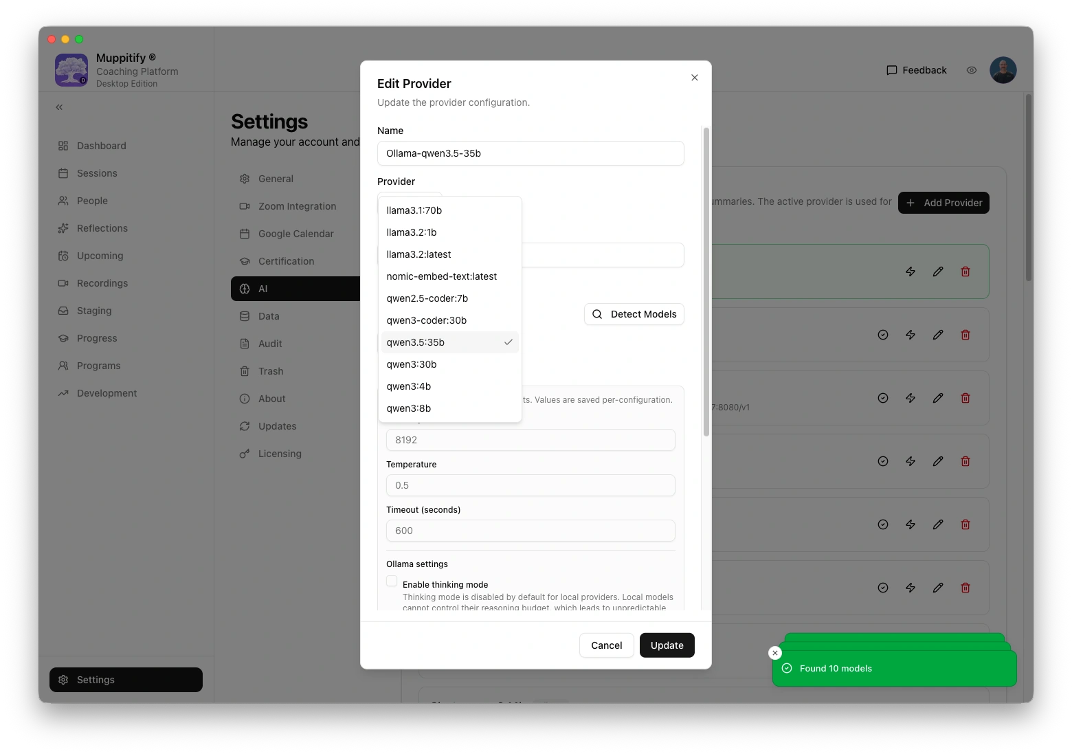 On systems with 16 GB RAM, Ollama may not have enough context for long transcripts. The coaching platform automatically adjusts for this, but very long sessions may produce shorter assessments. Consider using OpenAI for long transcripts.