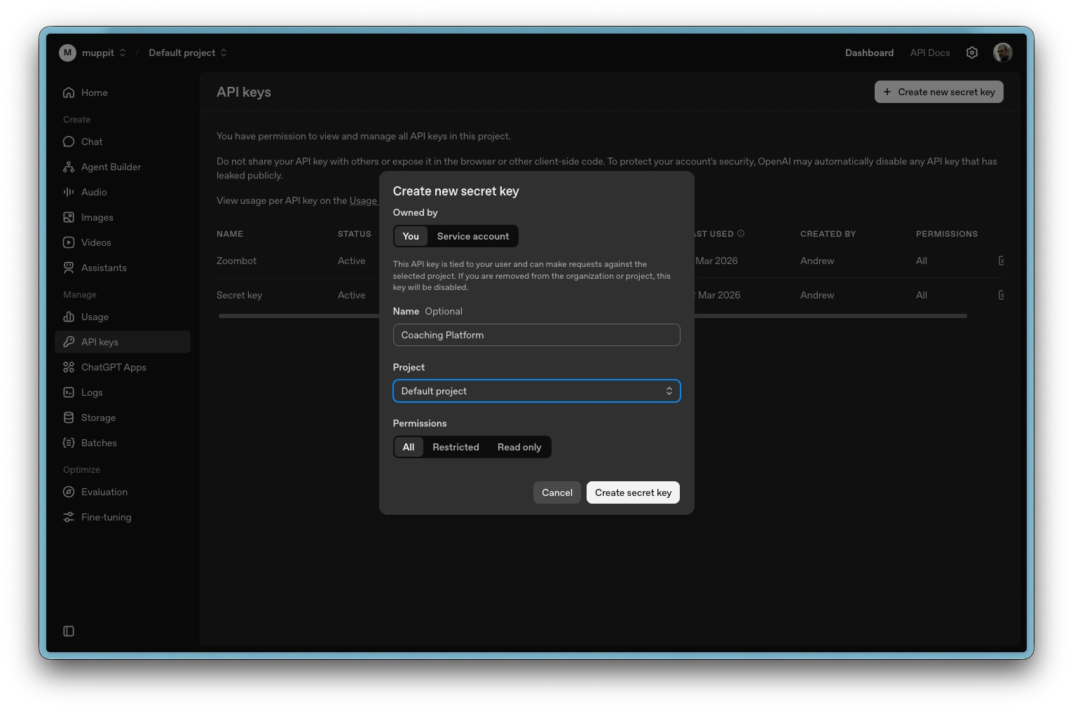 Verify the key is correct. Go to platform.openai.com/api-keys and check that the key exists and has not been revoked. If in doubt, create a new key and update it in the coaching platform.