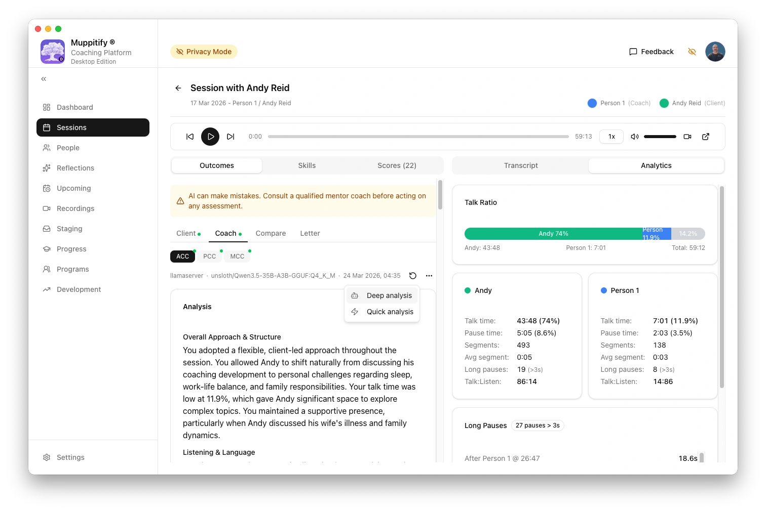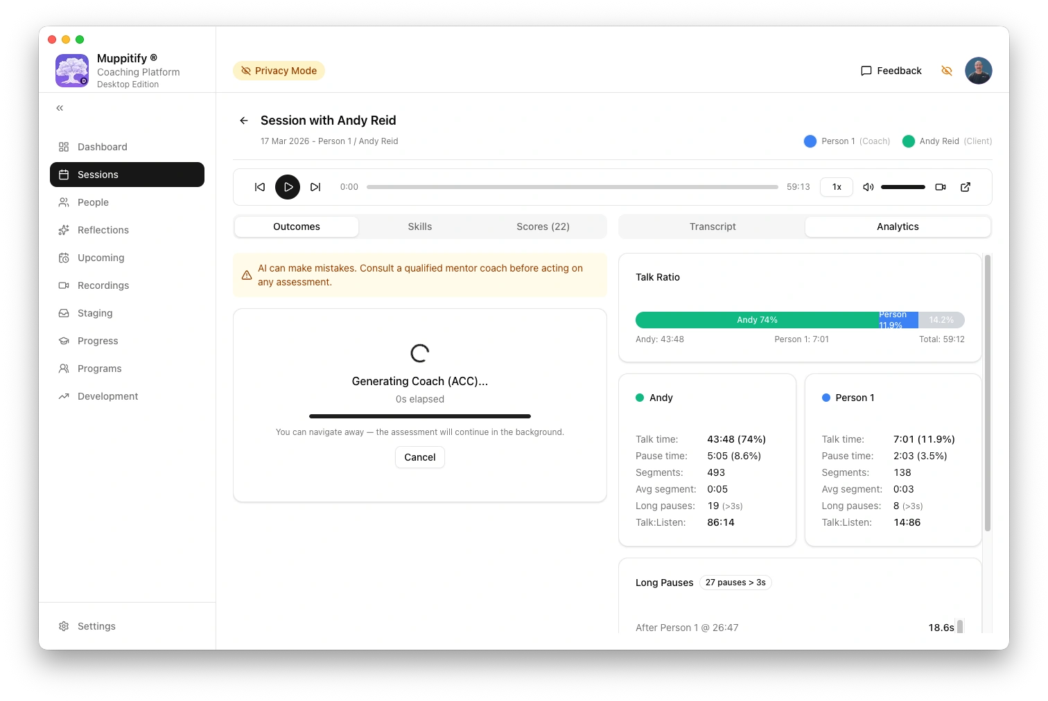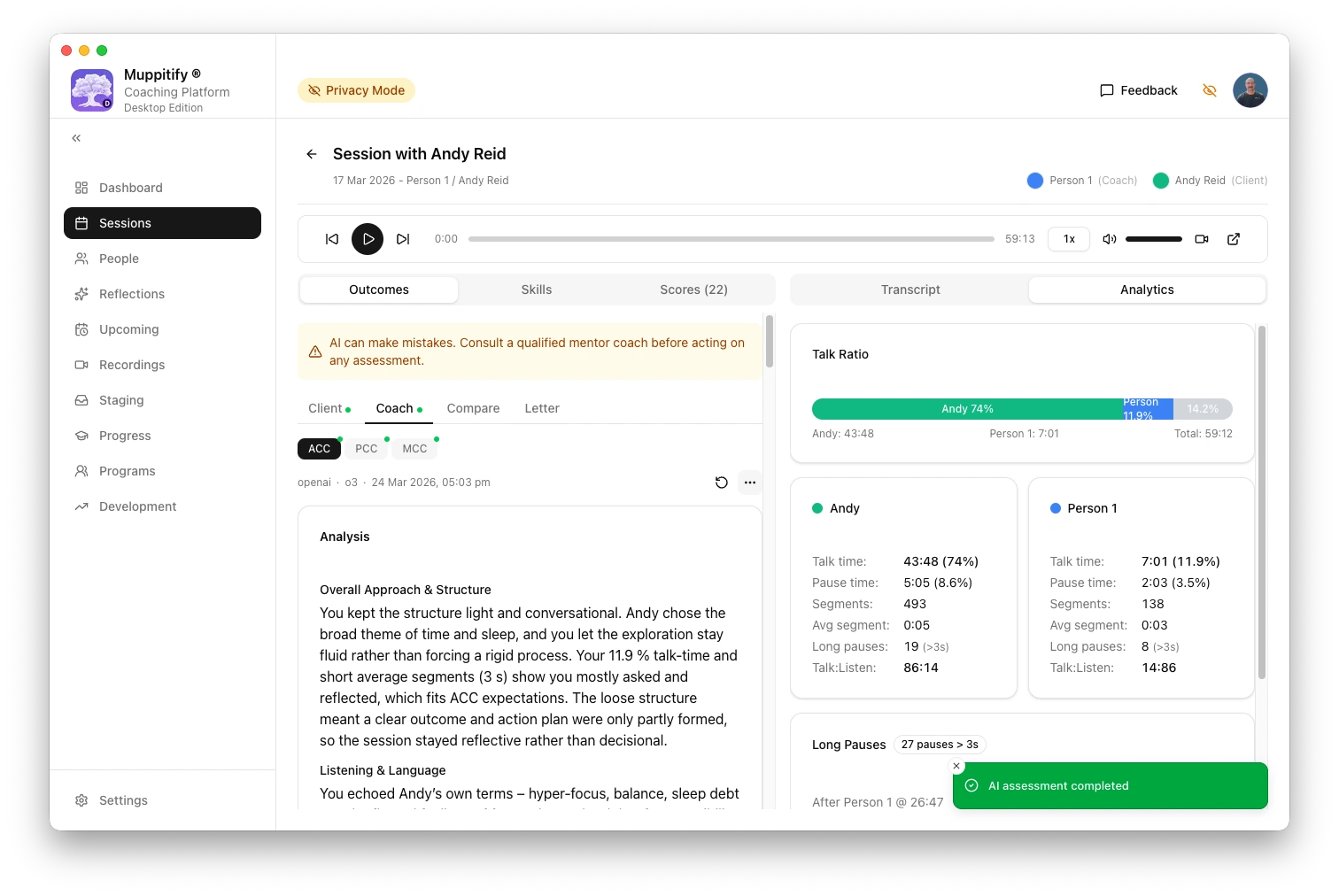 To test the connection, open any session with a recording and transcript, then click Generate AI Assessment.