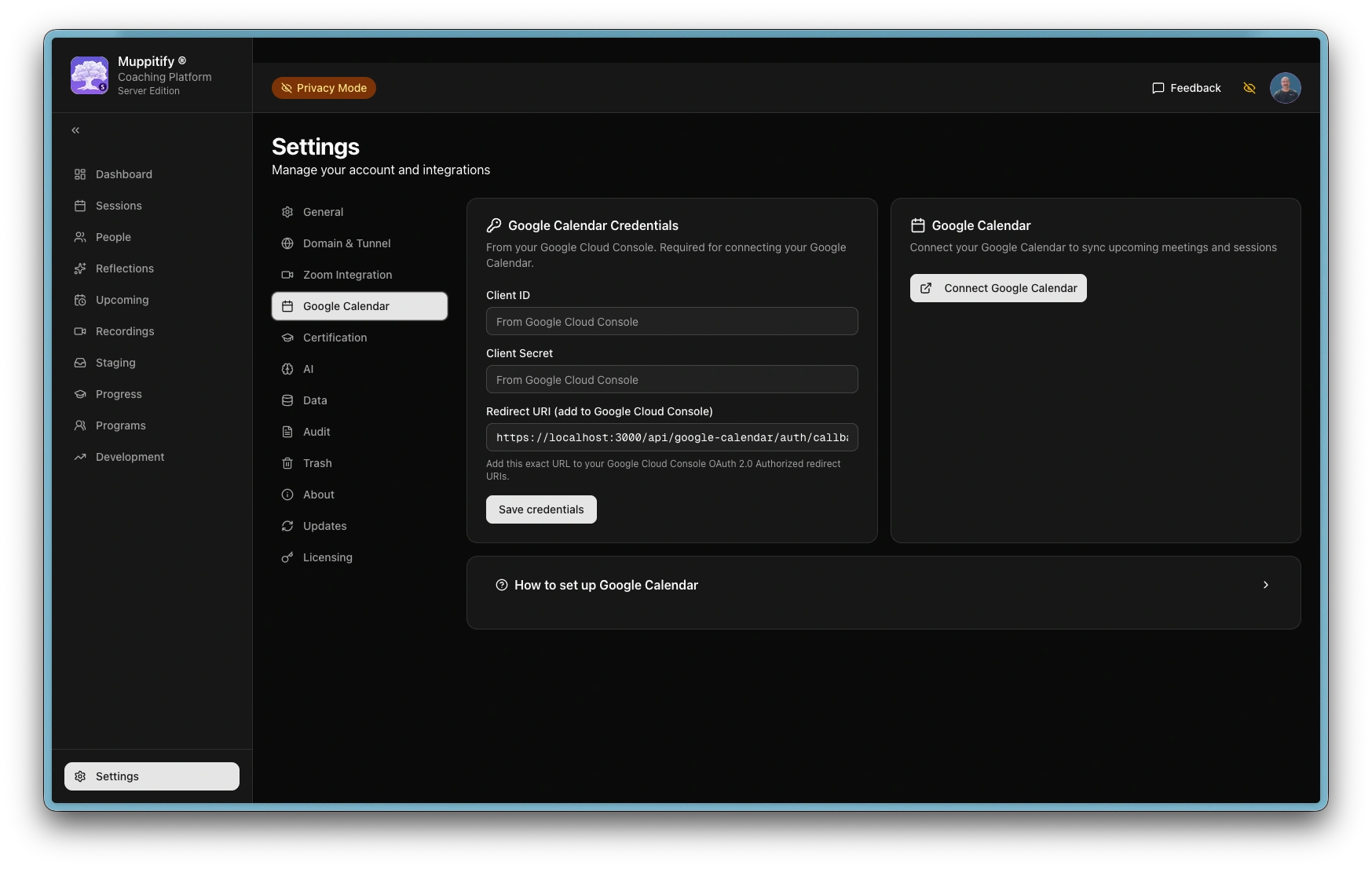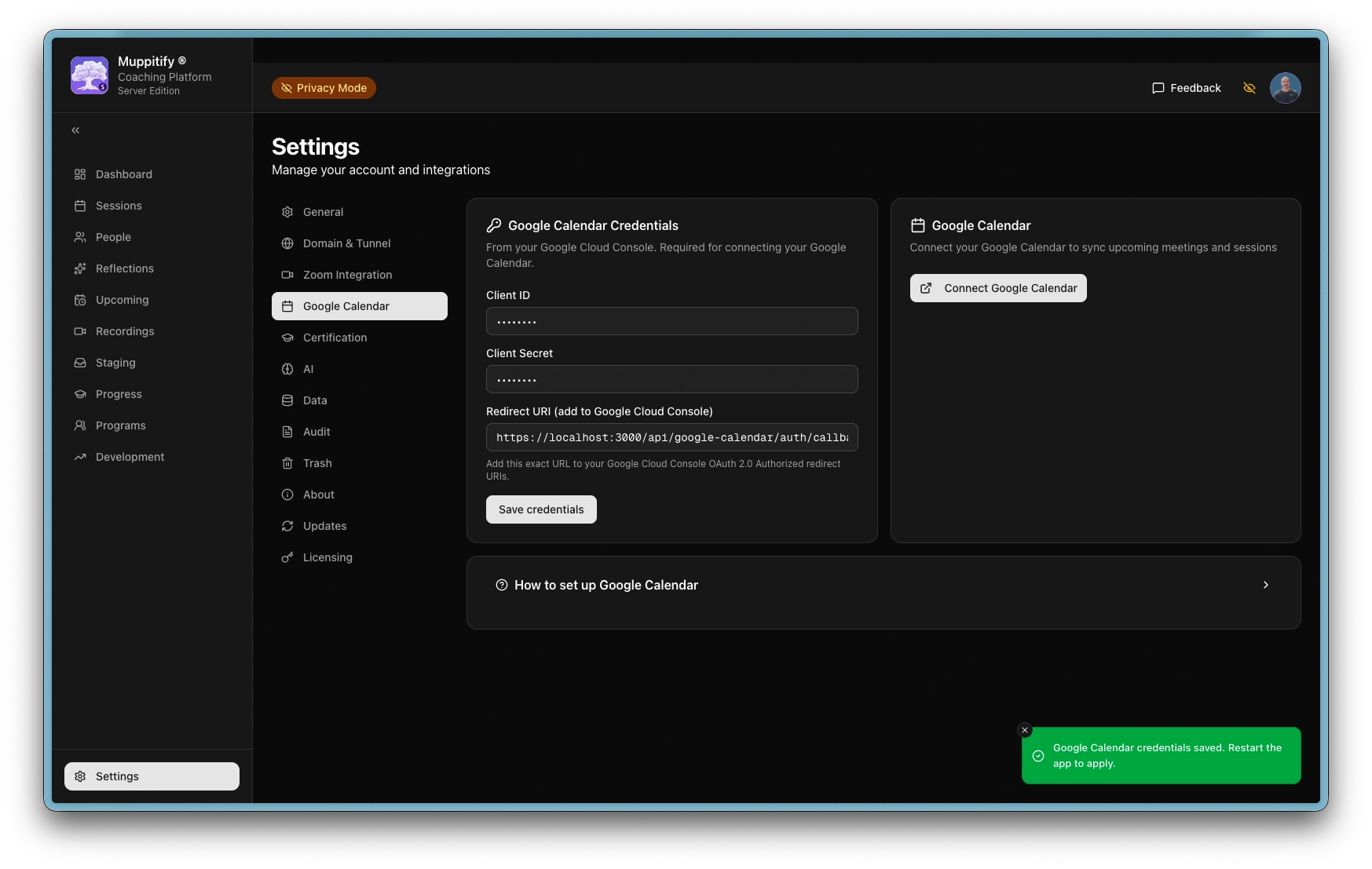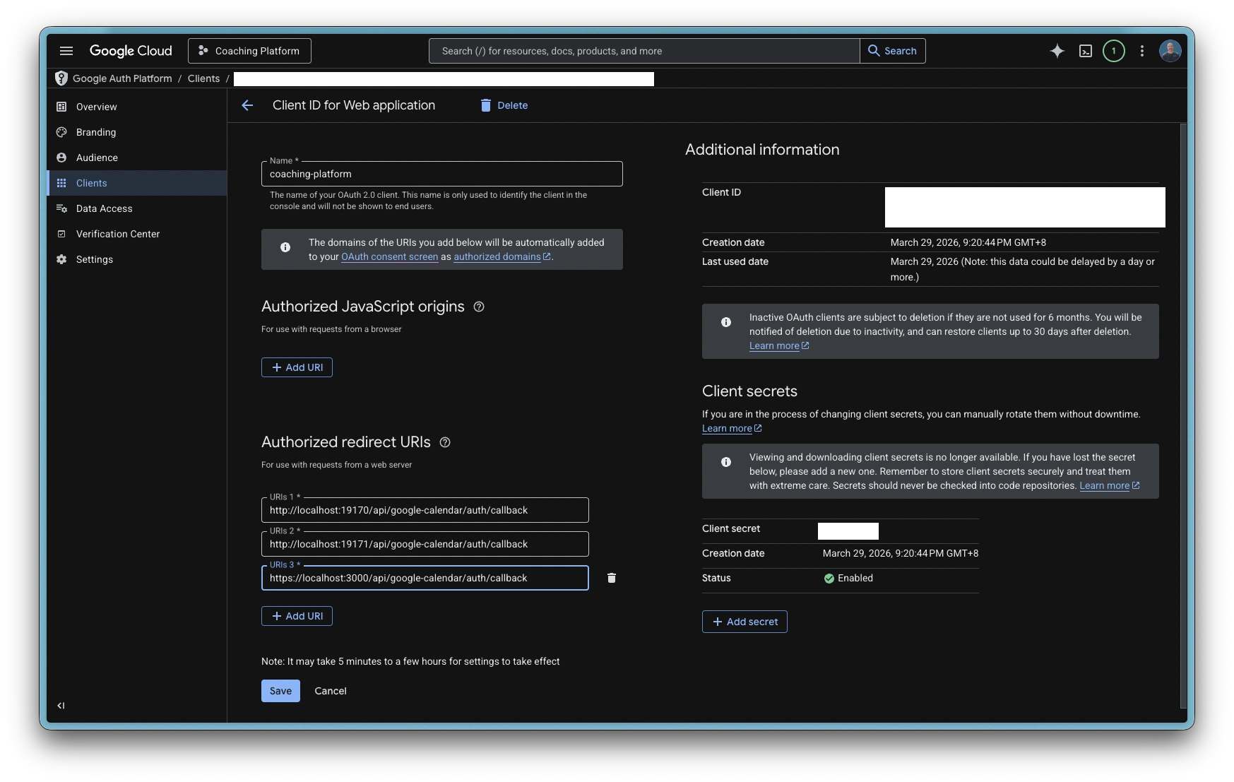 The redirect URI in the Google Cloud Console must exactly match the one shown in the coaching platform settings > Google Calendar. Check that the protocol (http vs https), hostname, and port all match.