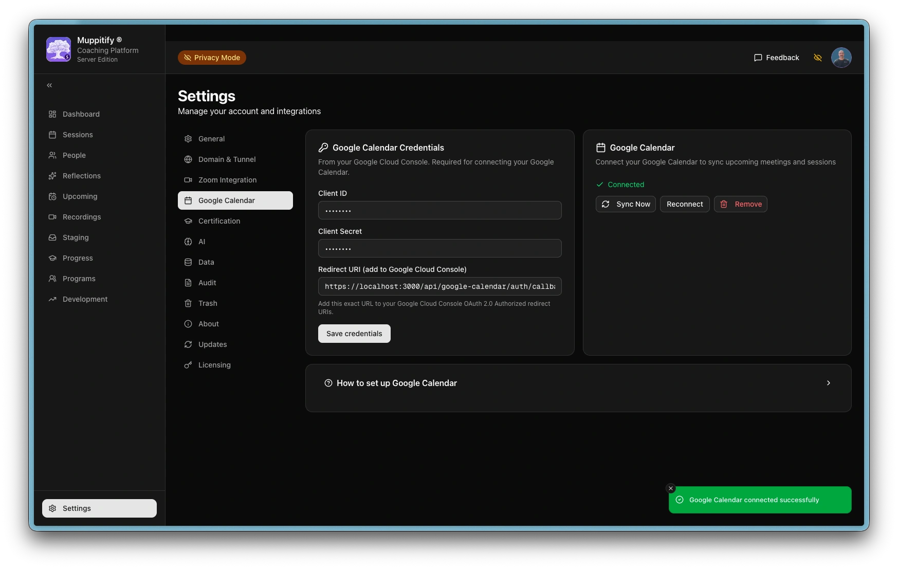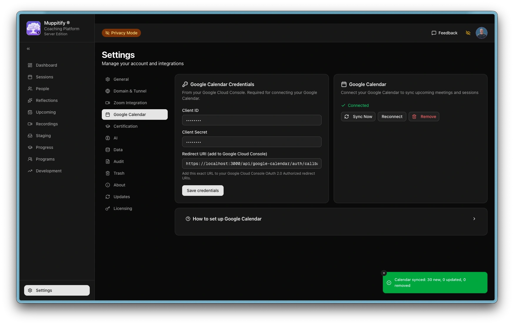 Sync your Google Calendar with the coaching platform Server Edition to view upcoming meetings and quickly create coaching sessions from calendar events.
