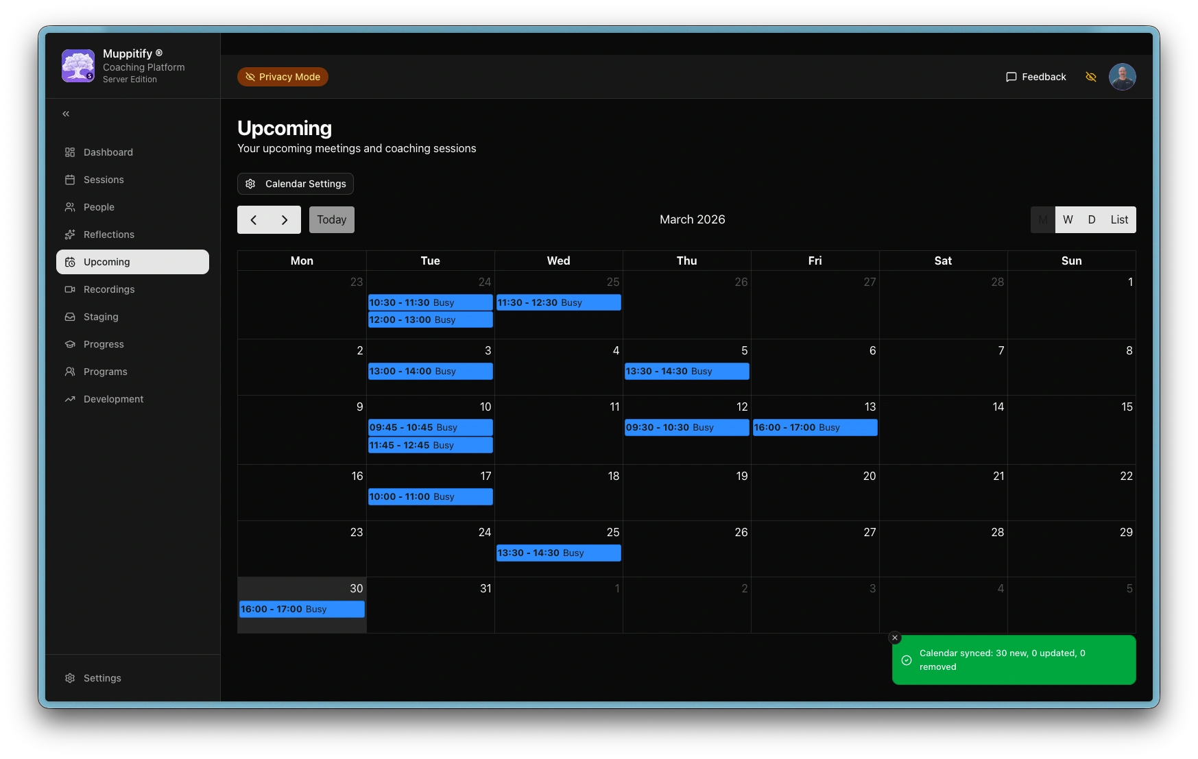 Calendar sync runs periodically. Click the refresh button on the Upcoming page to trigger a manual sync.