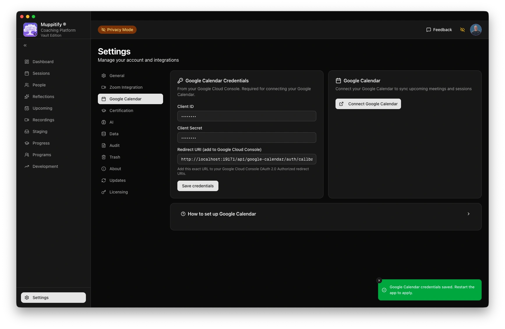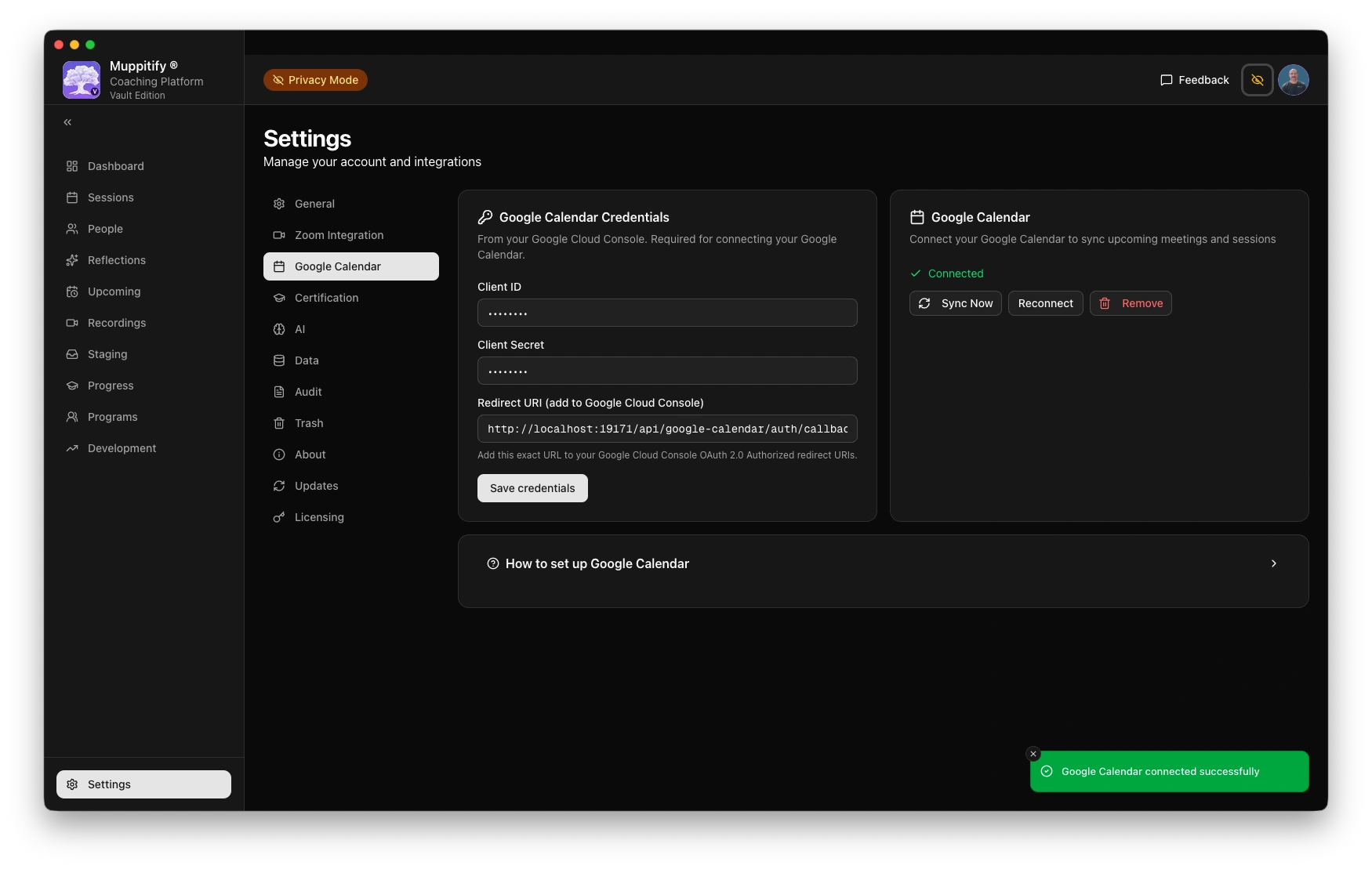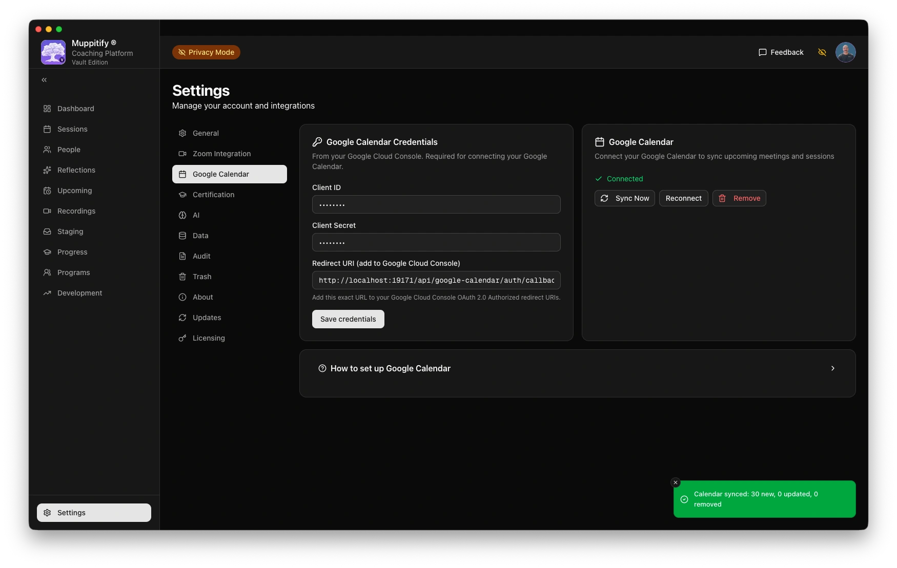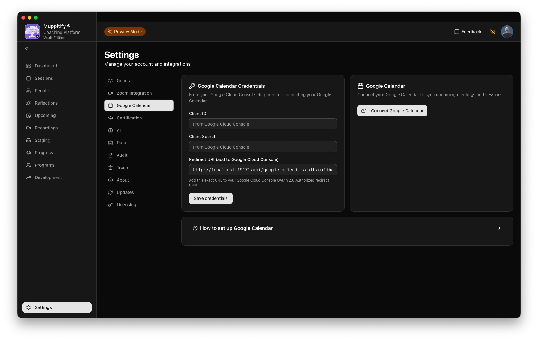 - Open the coaching platform and go to Settings > Google Calendar