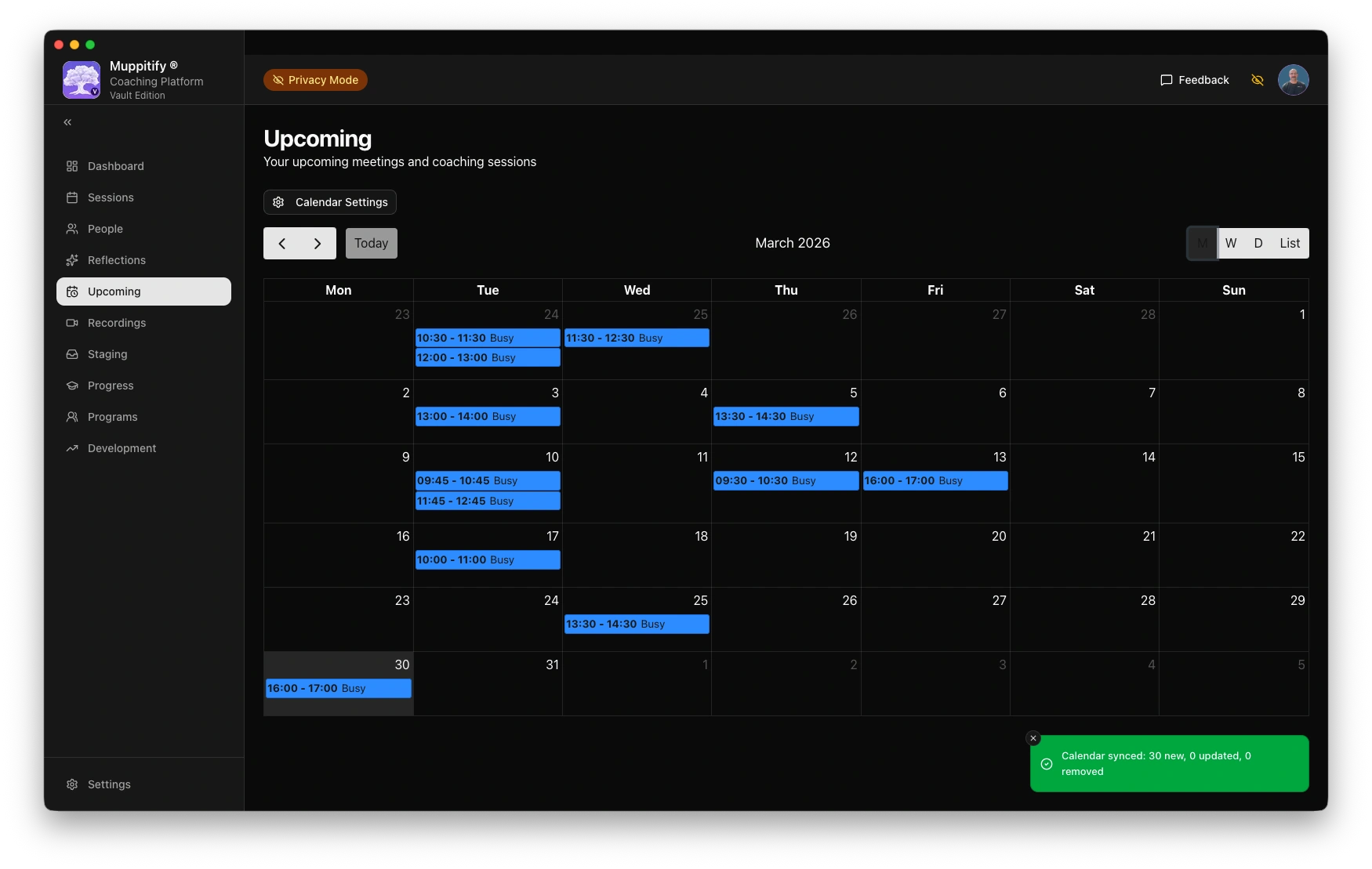 Sync your Google Calendar with the coaching platform to view upcoming meetings and quickly create coaching sessions from calendar events.