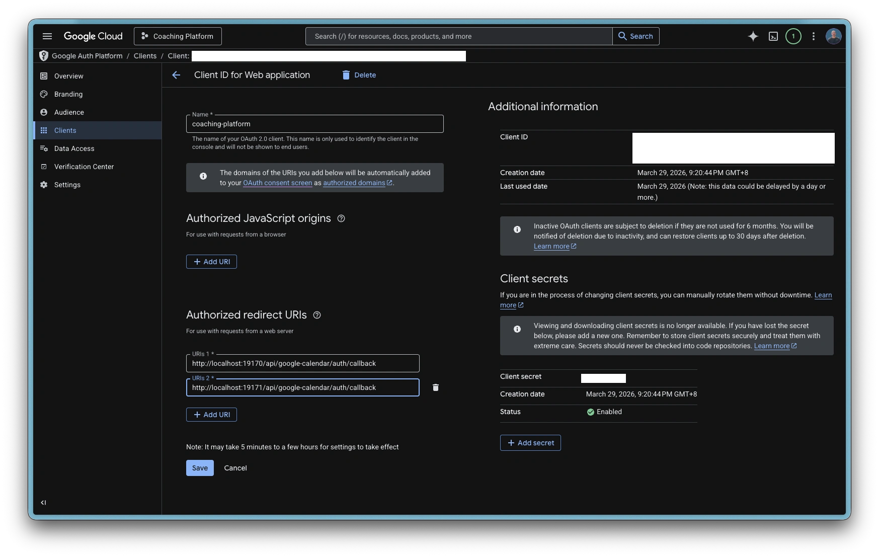http://localhost:19171/api/google-calendar/auth/callback. Note the app is using port 19171 not the default port - Click Create and note the Client ID and Client Secret
