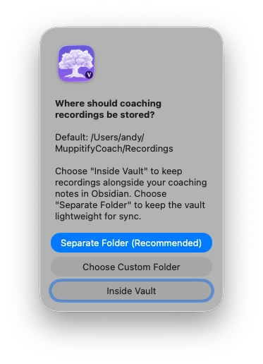 | Subfolder in an existing vault | Coaches already using Obsidian who want coaching data alongside their notes | ~/Documents/MyVault/Coaching/ |