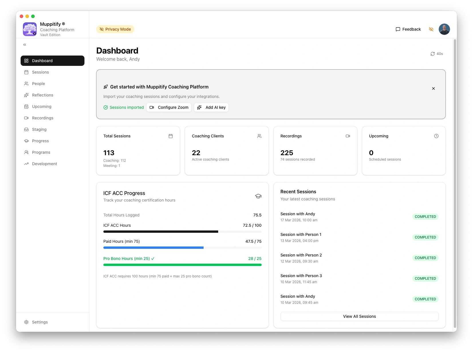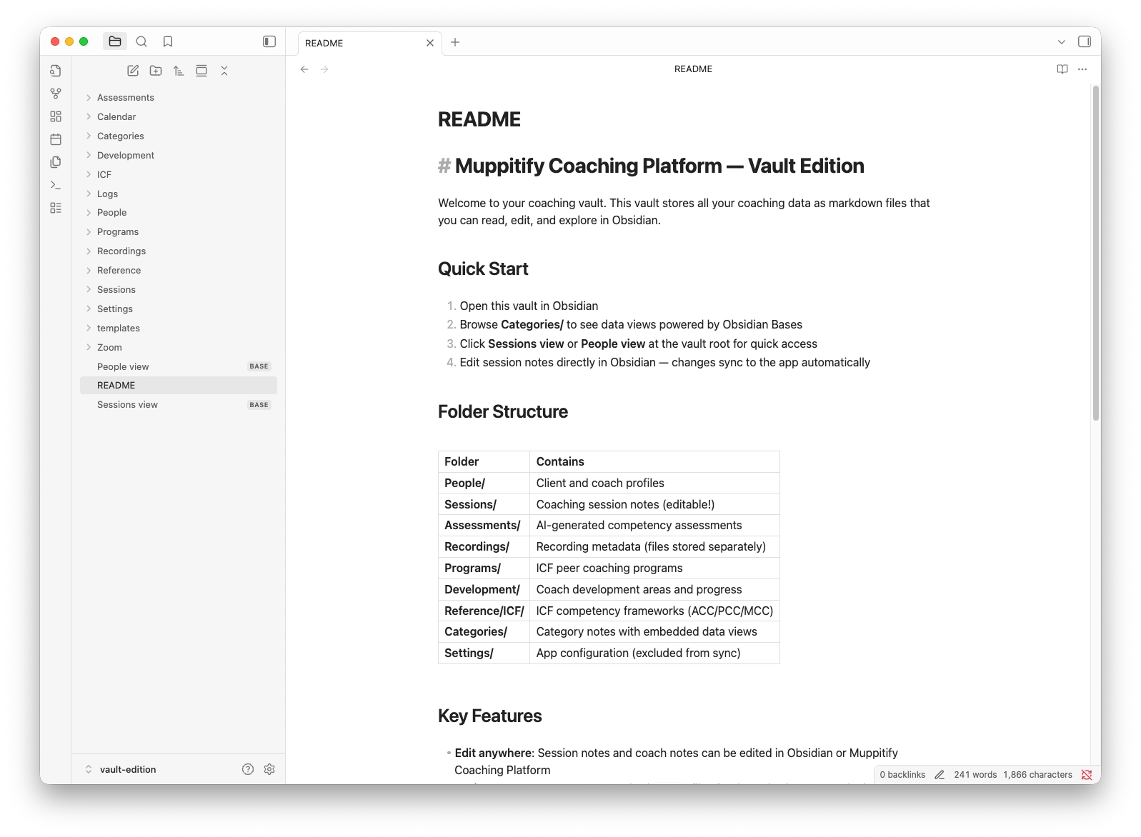 The Vault Edition stores all coaching data as markdown files in an Obsidian vault. Coaching sessions, people, recordings, programs, and assessments are all .md files with YAML frontmatter that you can view and edit in both the coaching platform and Obsidian.