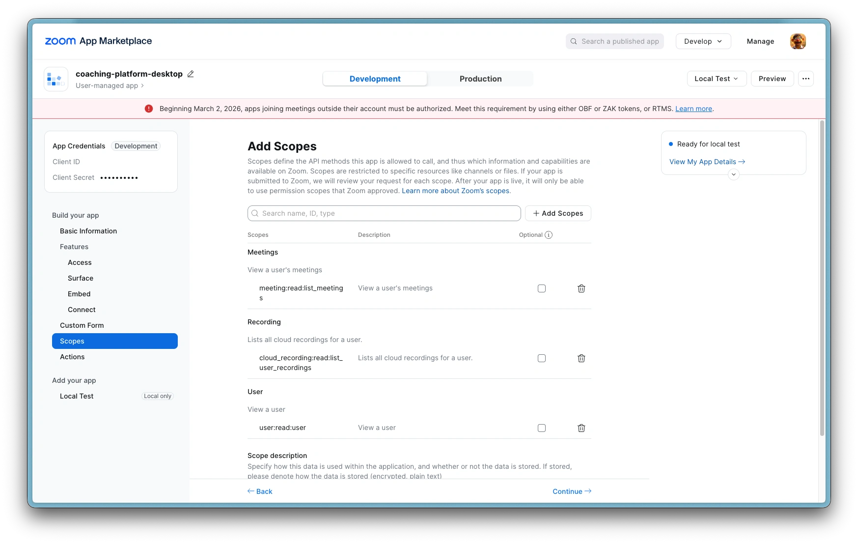 Zoom has migrated to granular scopes. If the exact scope names listed above don't appear, search for the closest read-only equivalents. The app needs permission to read your user profile, list meetings, and access cloud recordings.