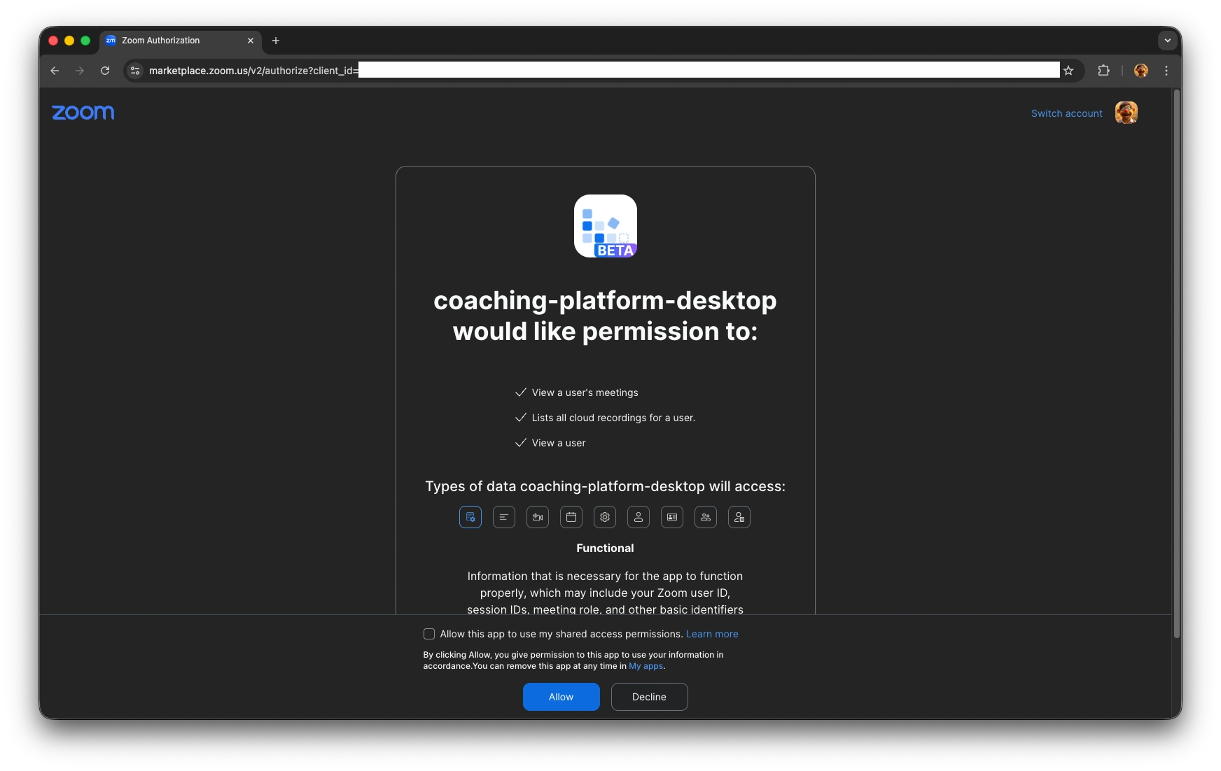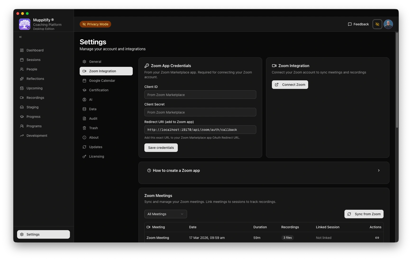 Connect your Zoom account to fetch cloud recordings directly into your coaching sessions. This requires creating a free OAuth app on the Zoom Marketplace.