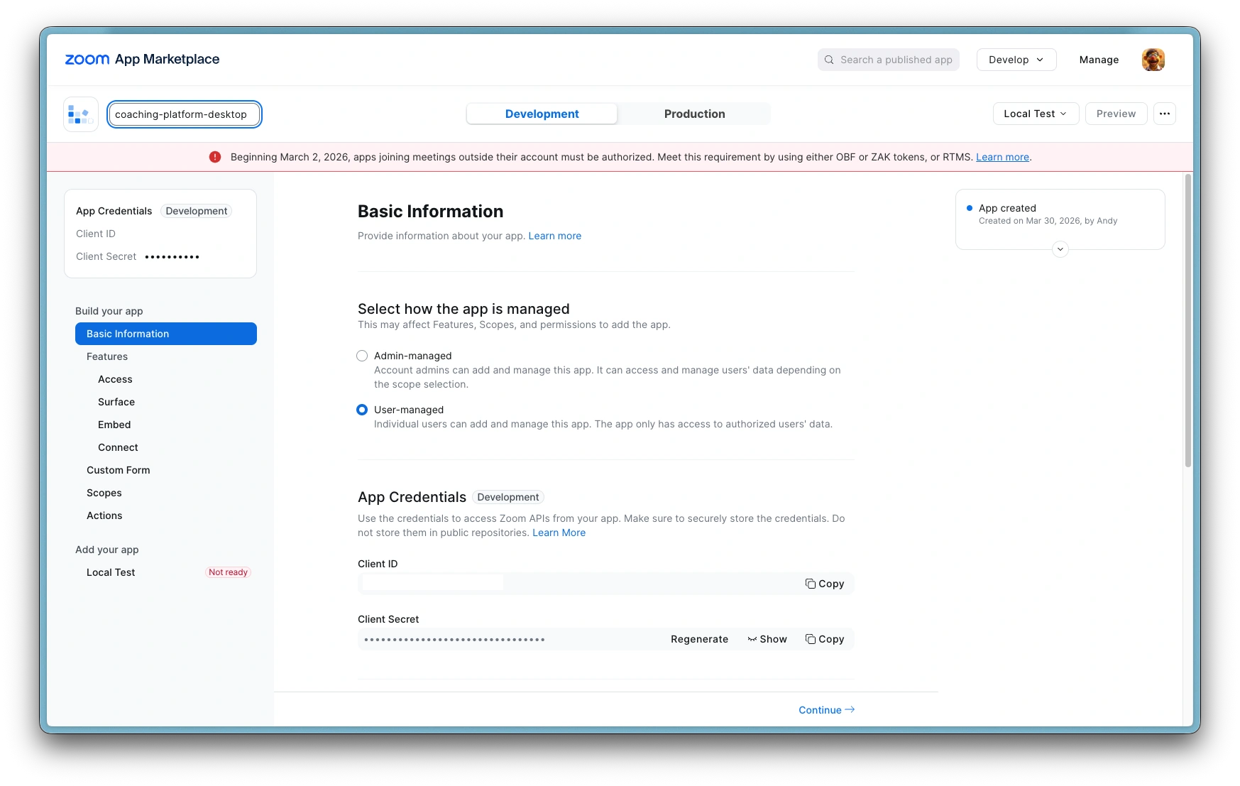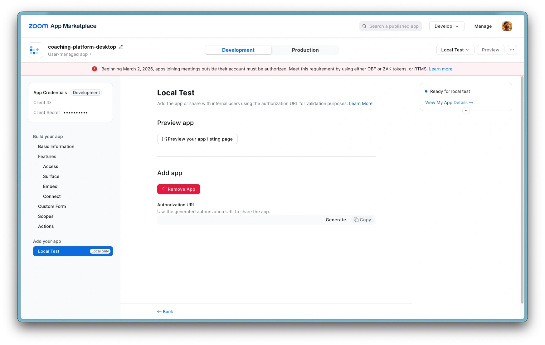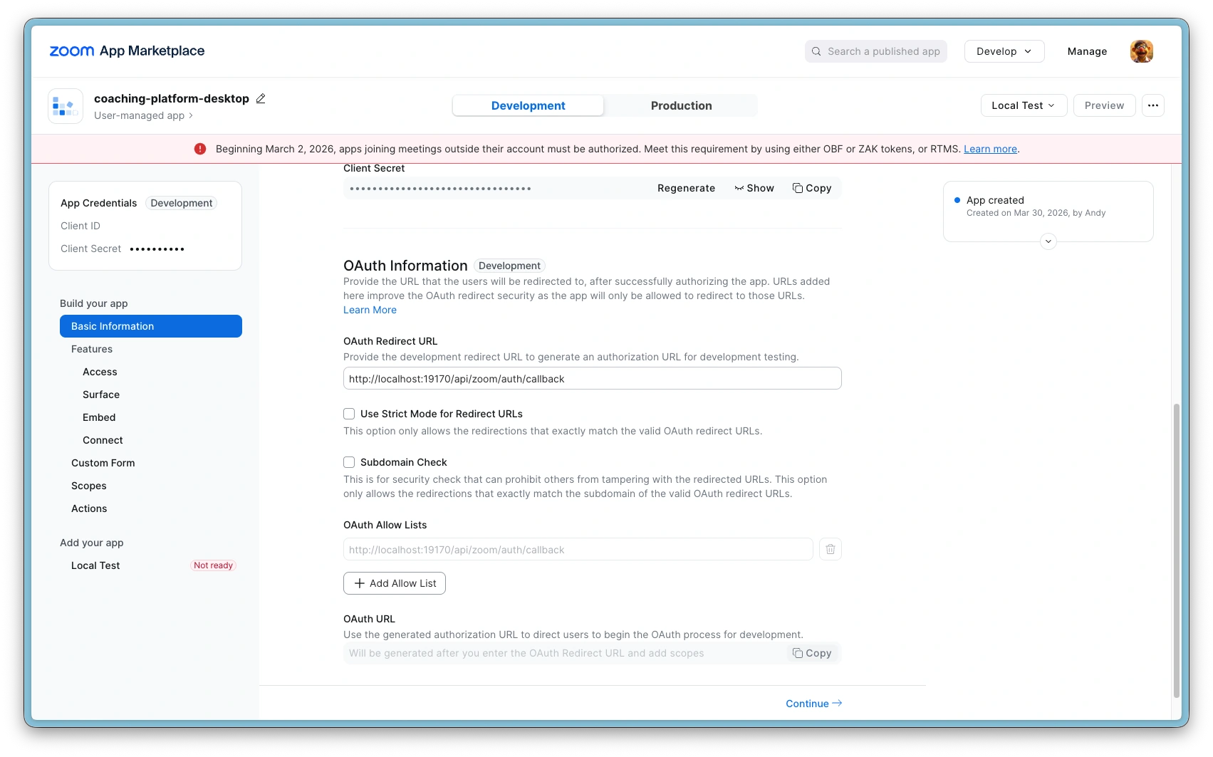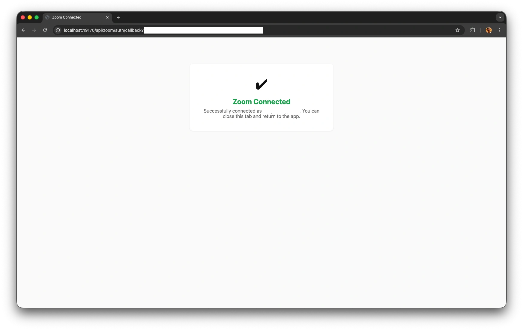 http://localhost:19170/api/zoom/auth/callback - Back in the Zoom Marketplace, paste this Redirect URI into the OAuth Redirect URL field