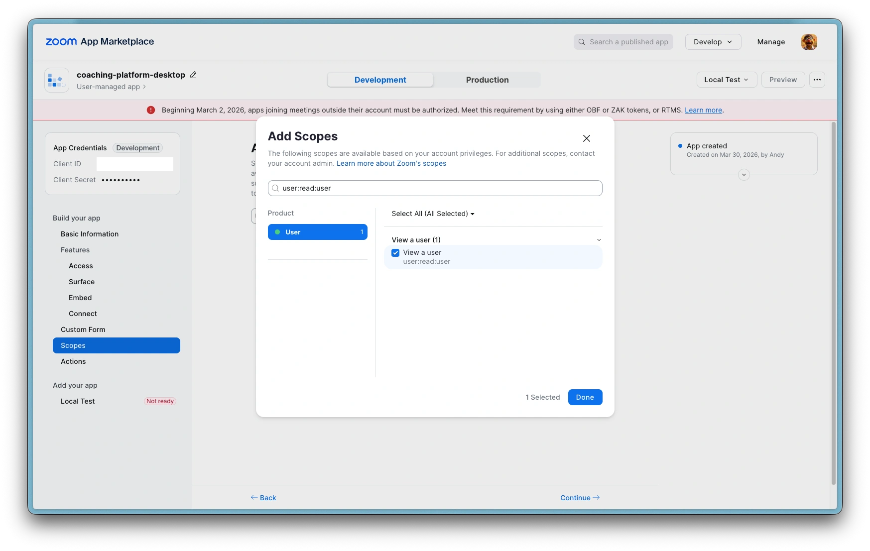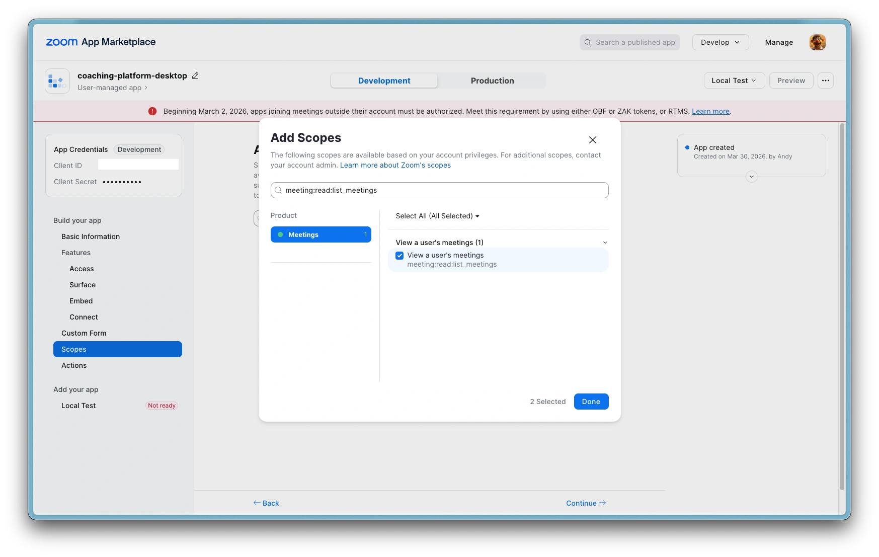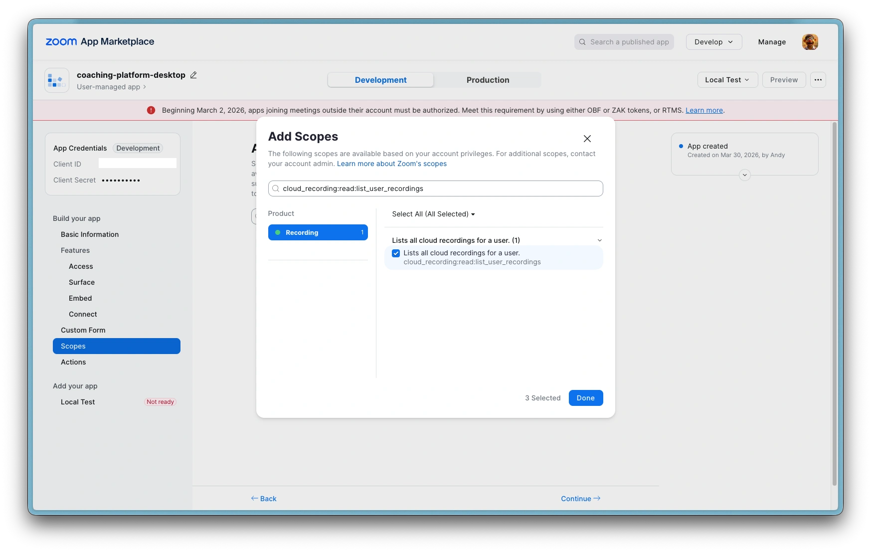 Zoom has migrated to granular scopes. If the exact scope names listed above don't appear, search for the closest read-only equivalents. The app needs permission to read your user profile, list meetings, and access cloud recordings.