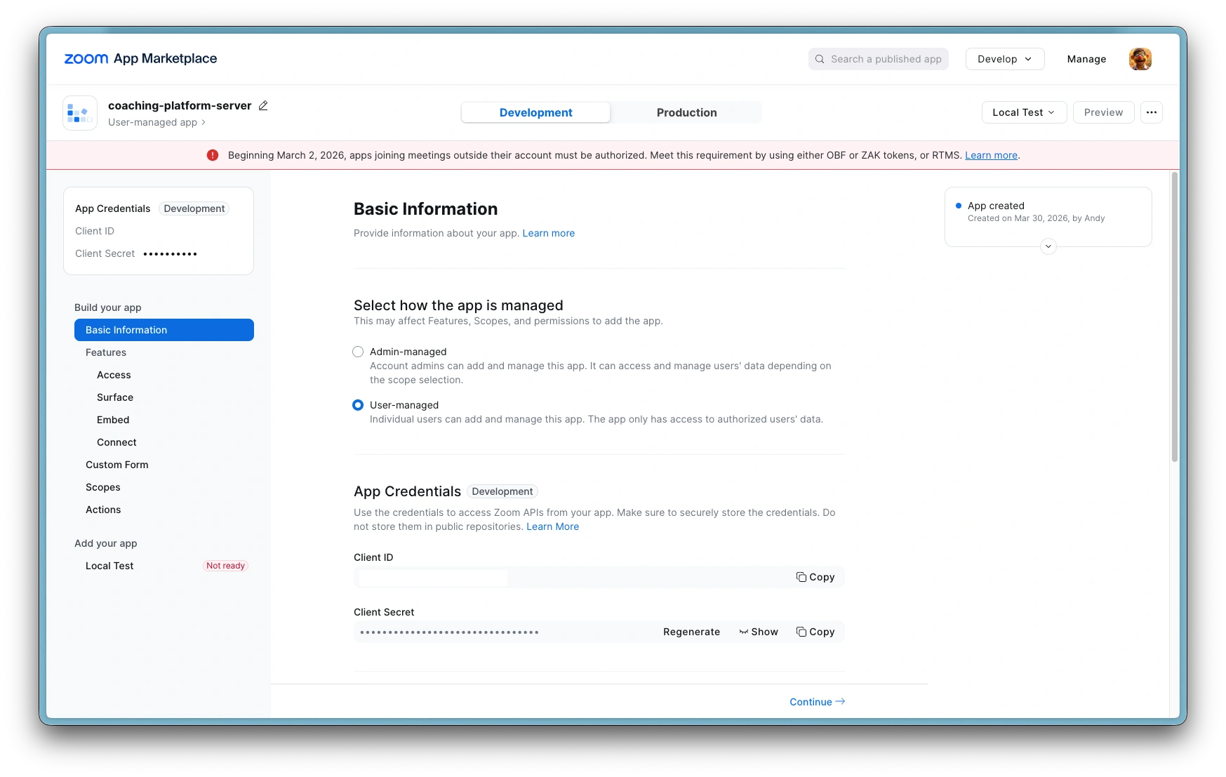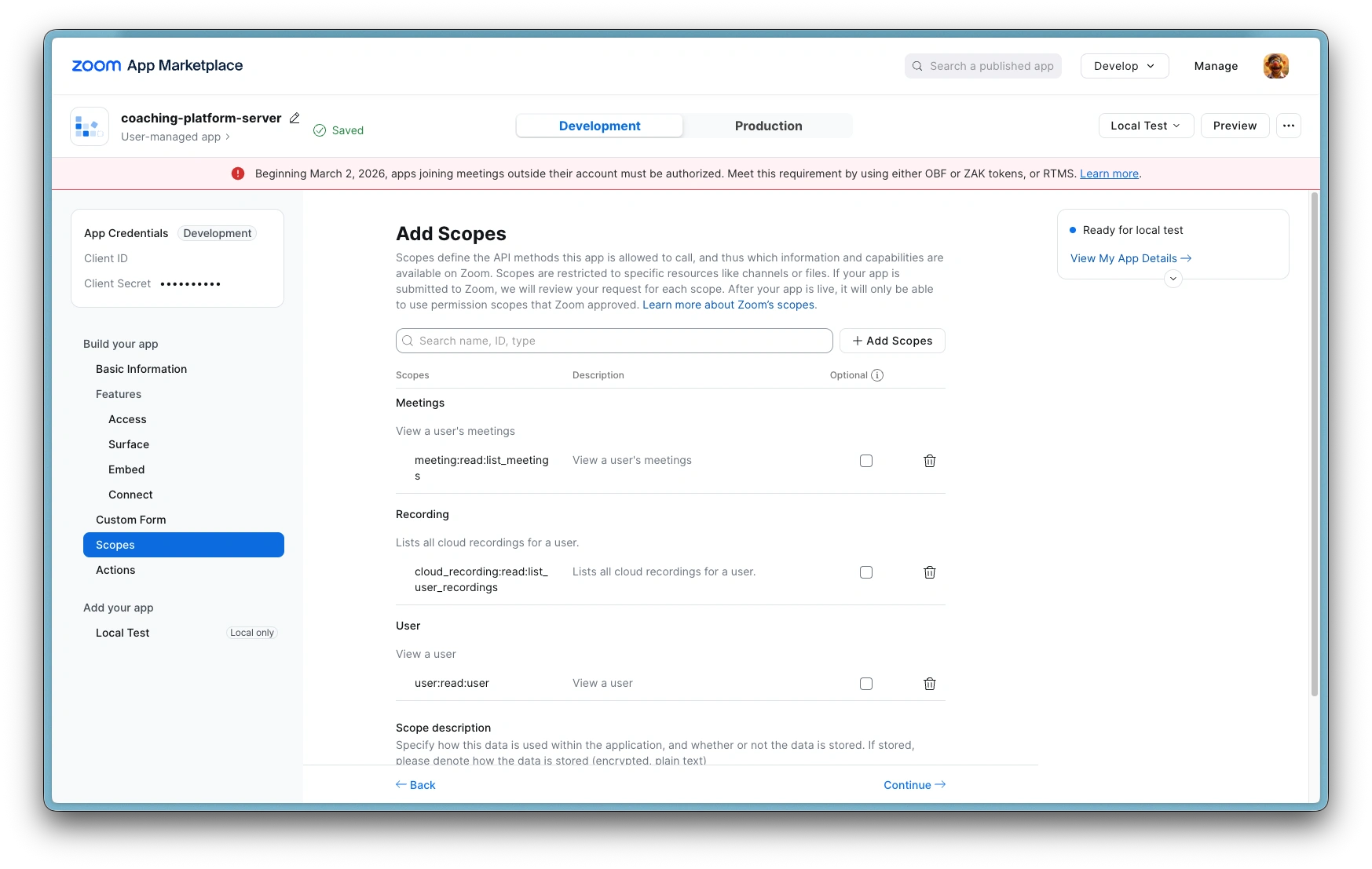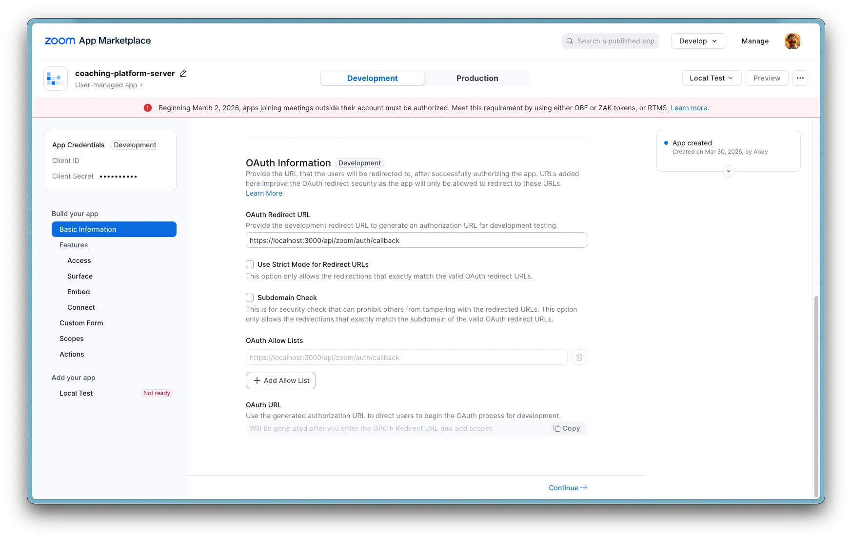 https://localhost:3000/api/zoom/auth/callback - Back in the Zoom Marketplace, paste this Redirect URI into the OAuth Redirect URL field