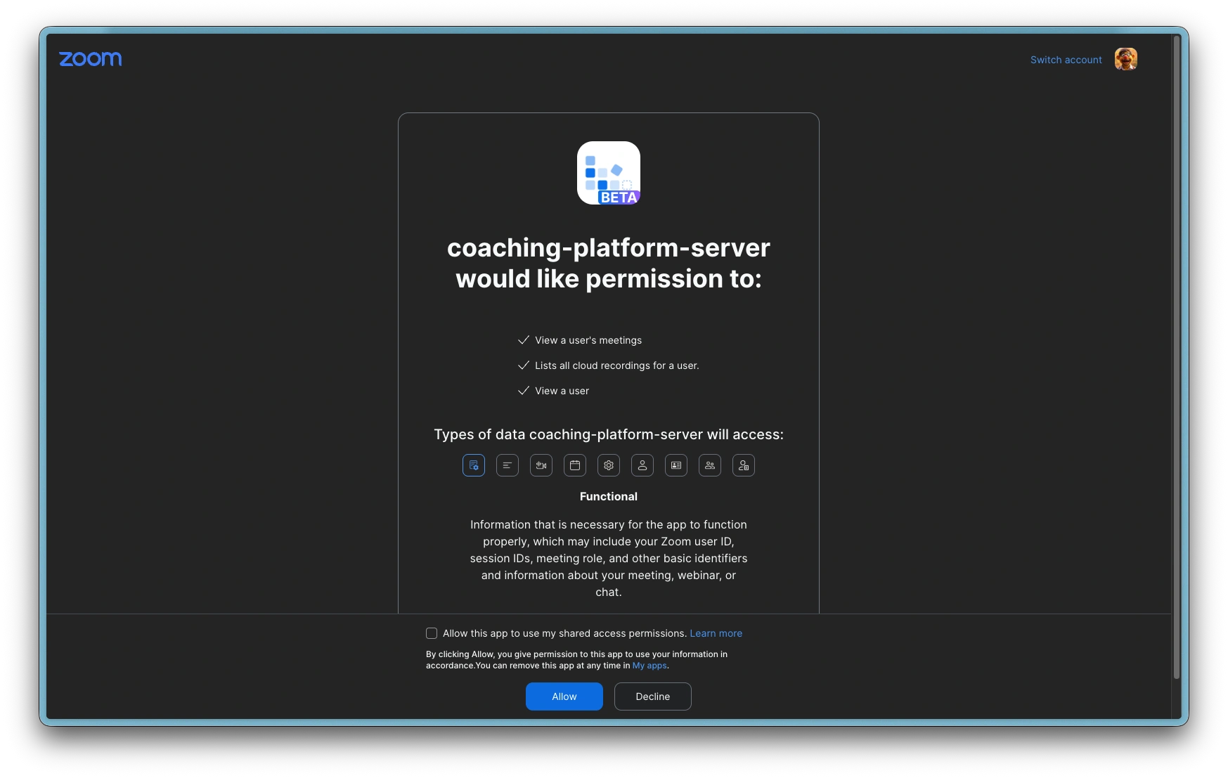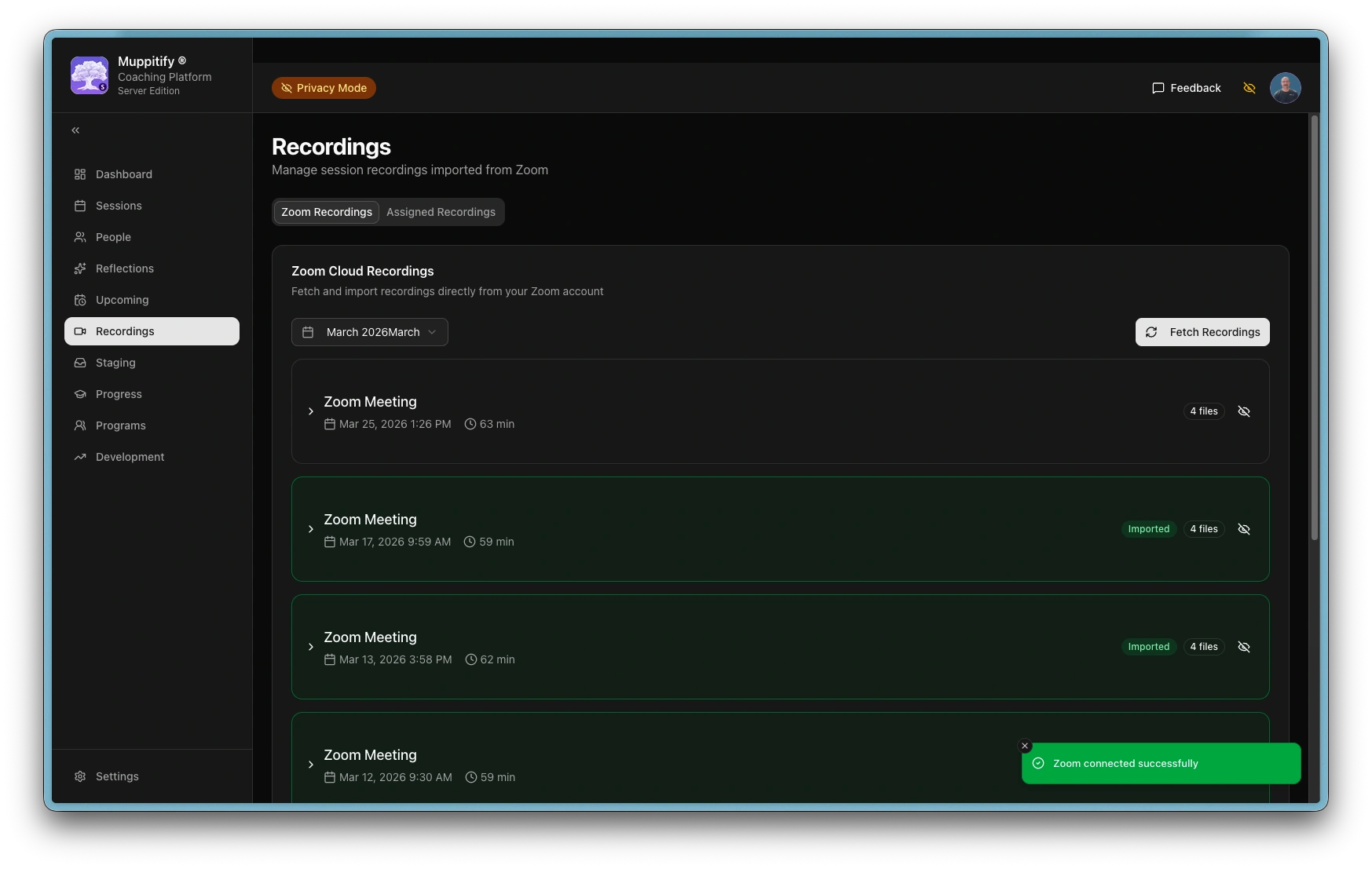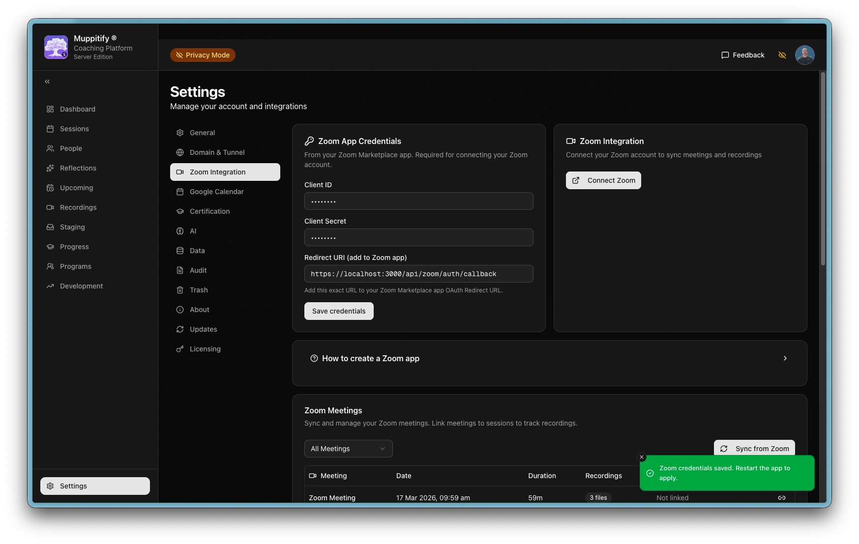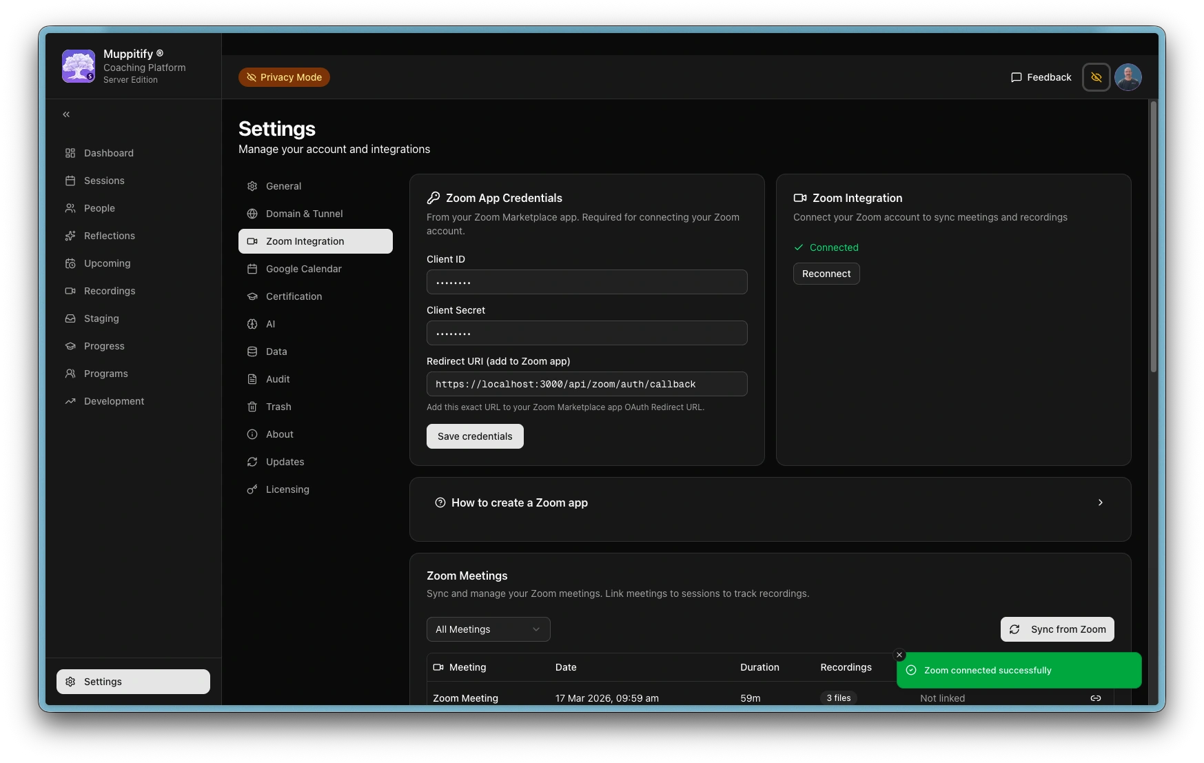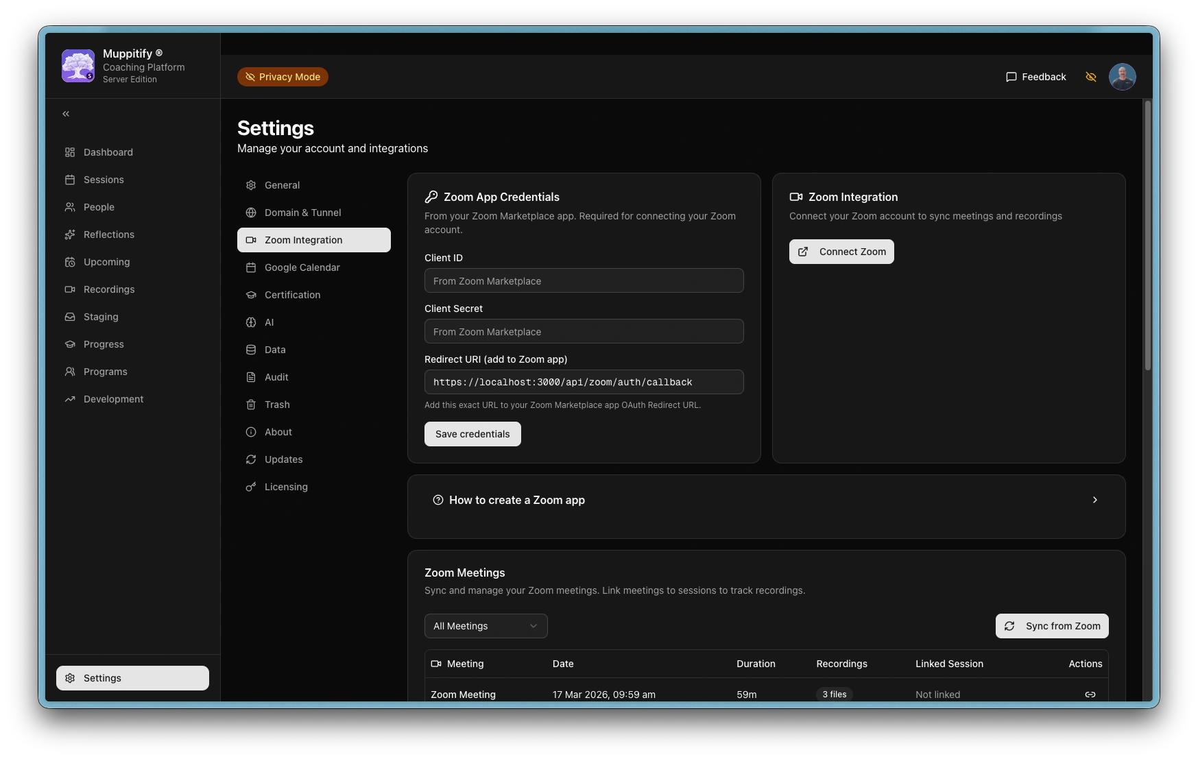 Connect your Zoom account to fetch cloud recordings directly into your coaching sessions. This requires creating a free OAuth app on the Zoom Marketplace.
