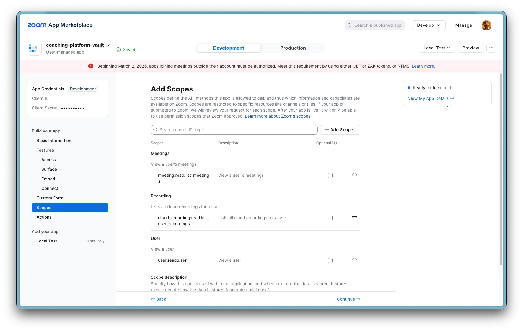 Zoom has migrated to granular scopes. If the exact scope names listed above don't appear, search for the closest read-only equivalents. The app needs permission to read your user profile, list meetings, and access cloud recordings.