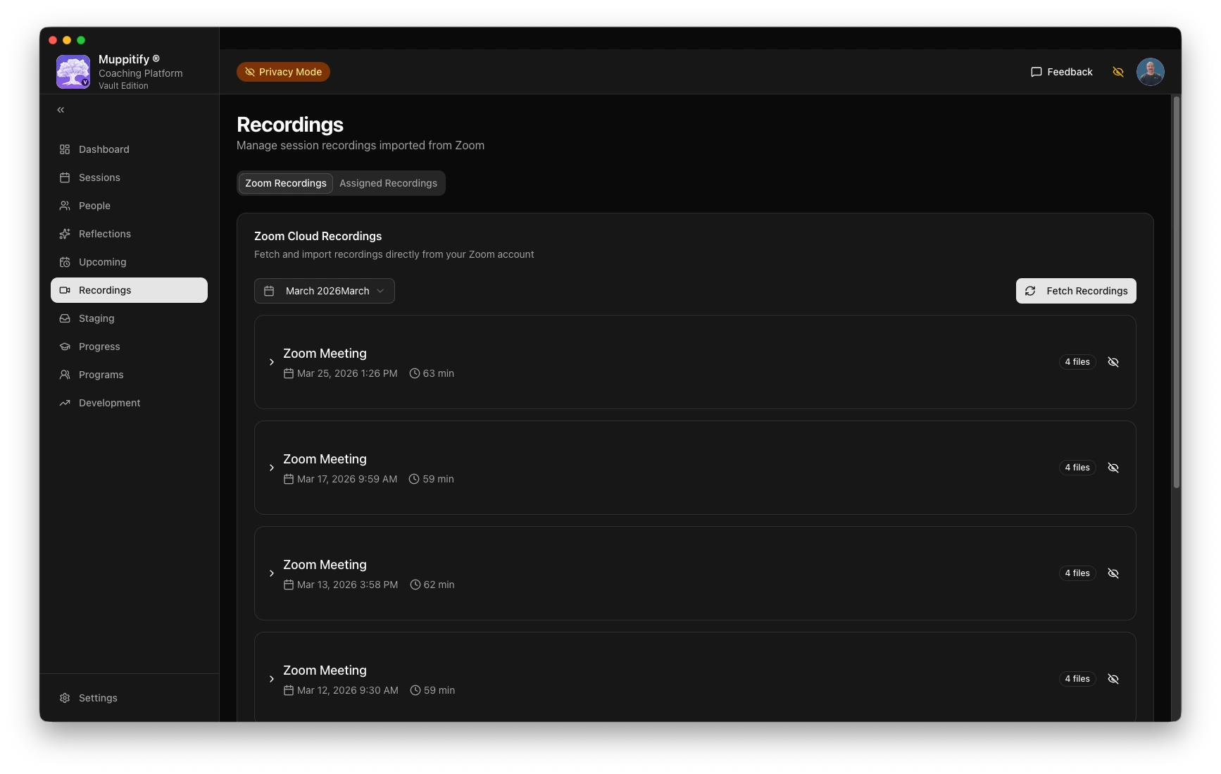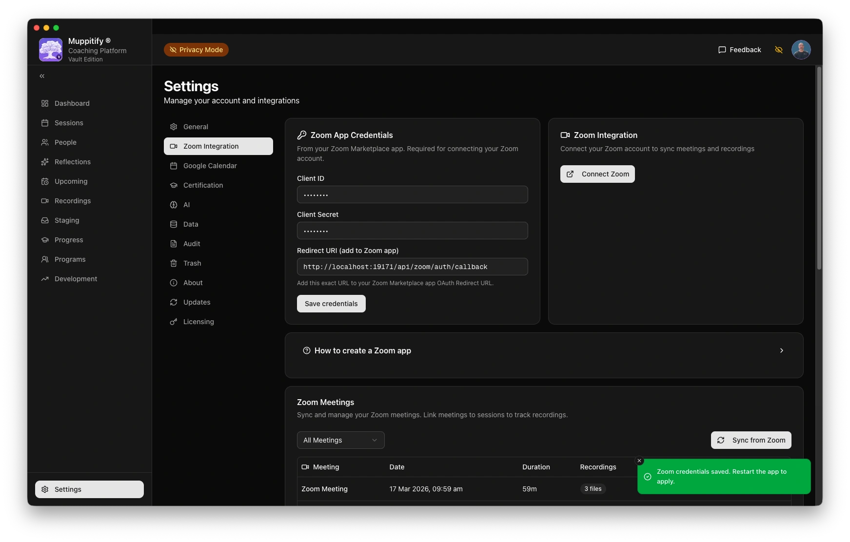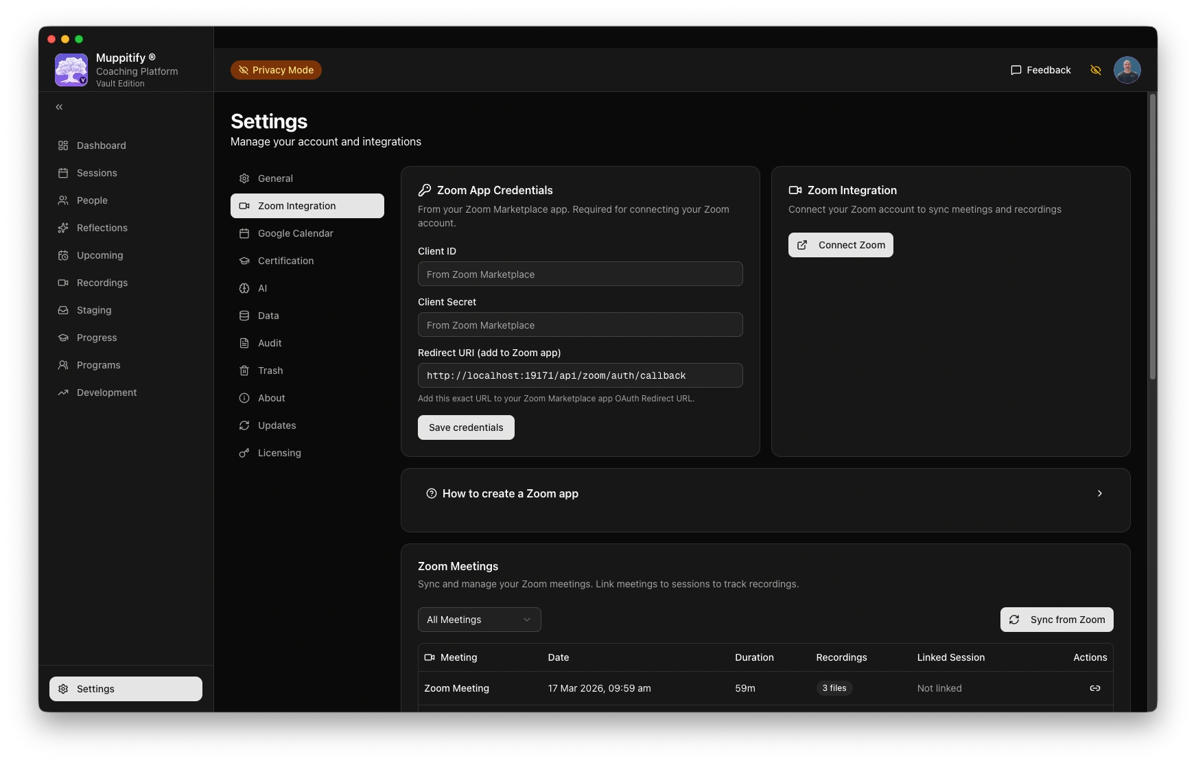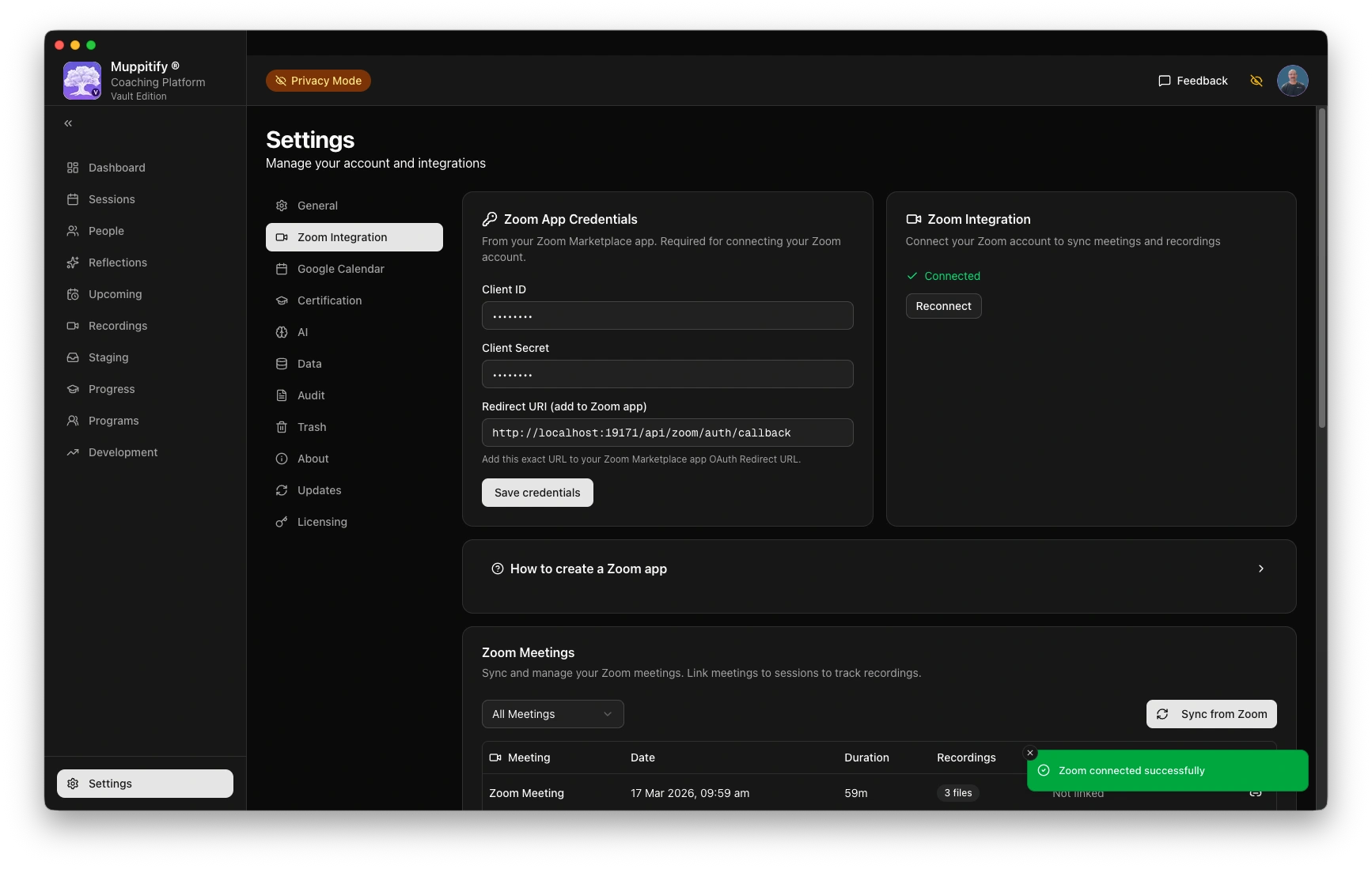 Connect your Zoom account to fetch cloud recordings directly into your coaching sessions. This requires creating a free OAuth app on the Zoom Marketplace.
