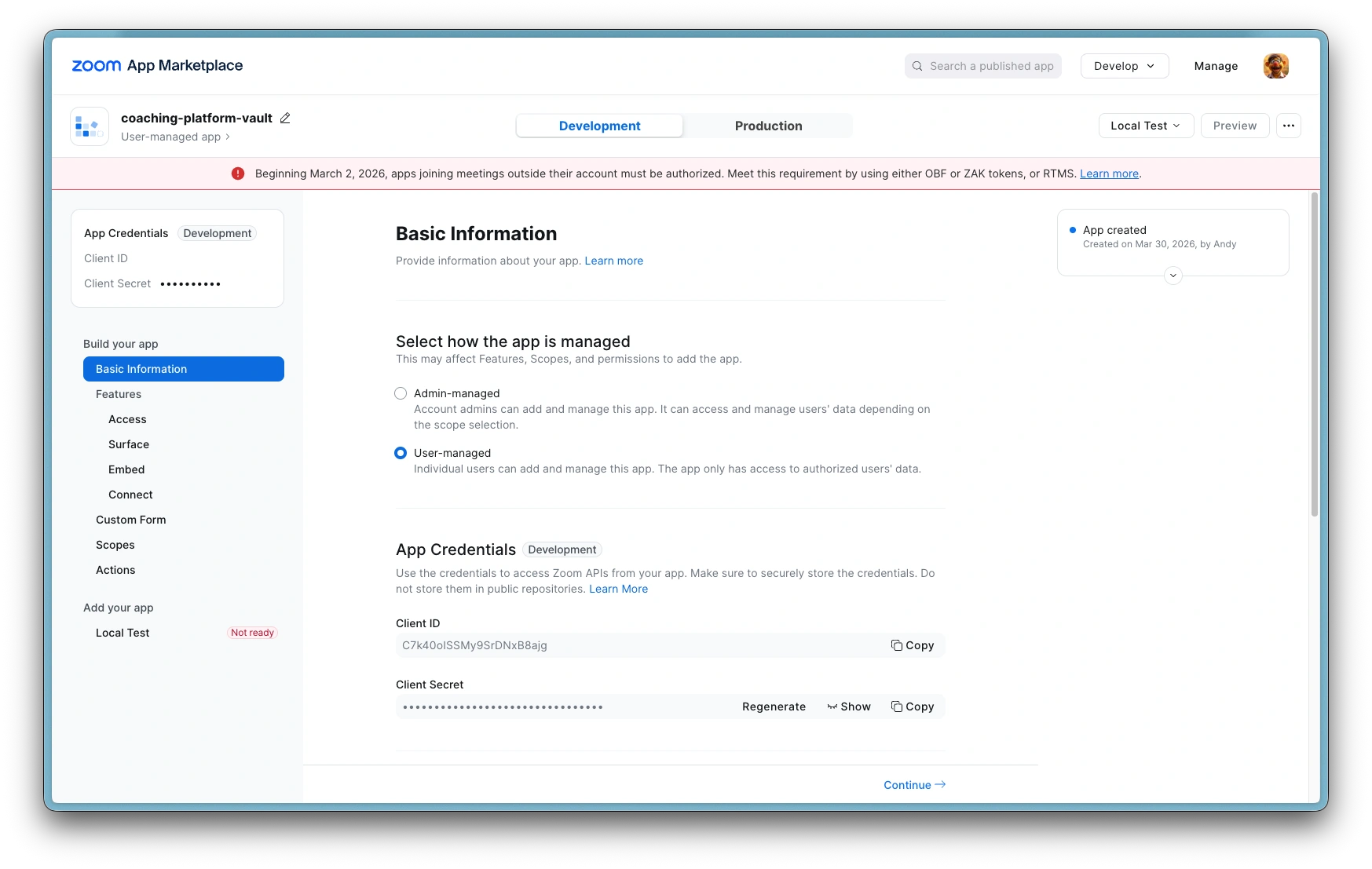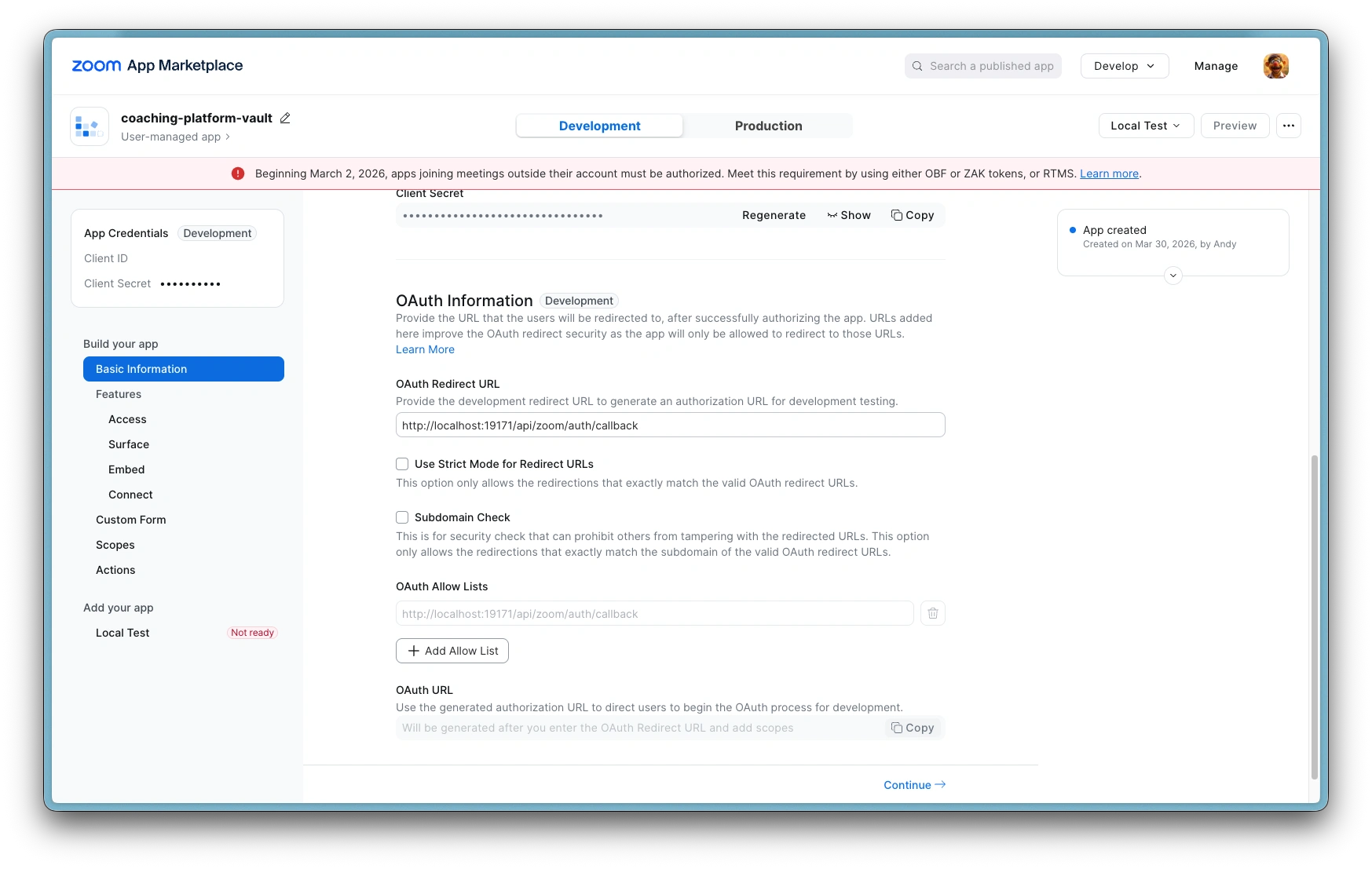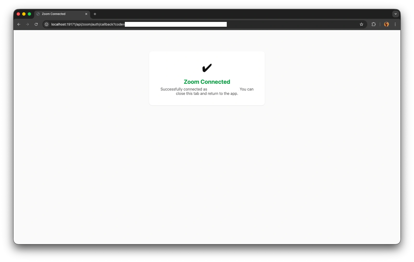 http://localhost:19171/api/zoom/auth/callback. In this example the default port 19170 is in use and the app has chosen the next free port 19171 - Back in the Zoom Marketplace, paste this Redirect URI into the OAuth Redirect URL field