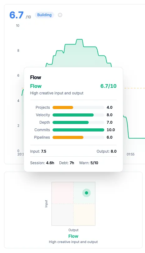 This is why Flow Control uses a time-series chart as the primary visualisation — the composite flow score spikes when multiple projects are active in parallel, request velocity is high, sessions are deep, and commits are flowing constantly. When all of those converge, that is a 9 or 10. Light single-project work after a break is a 3 or 4 — not bad, just not flow.
