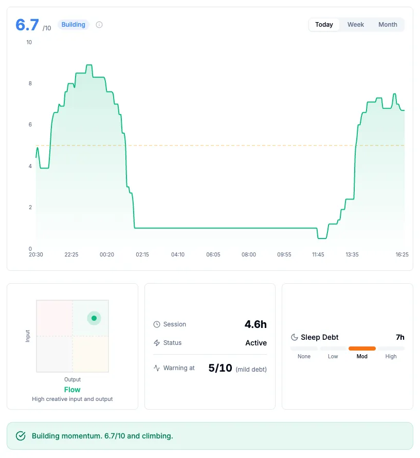 Sleep debt does not prevent flow — I have proven that. But it shortens the runway. With good sleep, flow might sustain for 10+ hours. With 25 hours of debt, the cliff might come at 4-5 hours. The warning threshold in Flow Control triggers earlier when sleep debt is high: