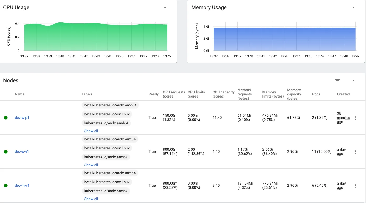 - Connecting to the dashboard and navigating to Nodes shows all three nodes, the physical worker node has 64GB memory and 12 cores