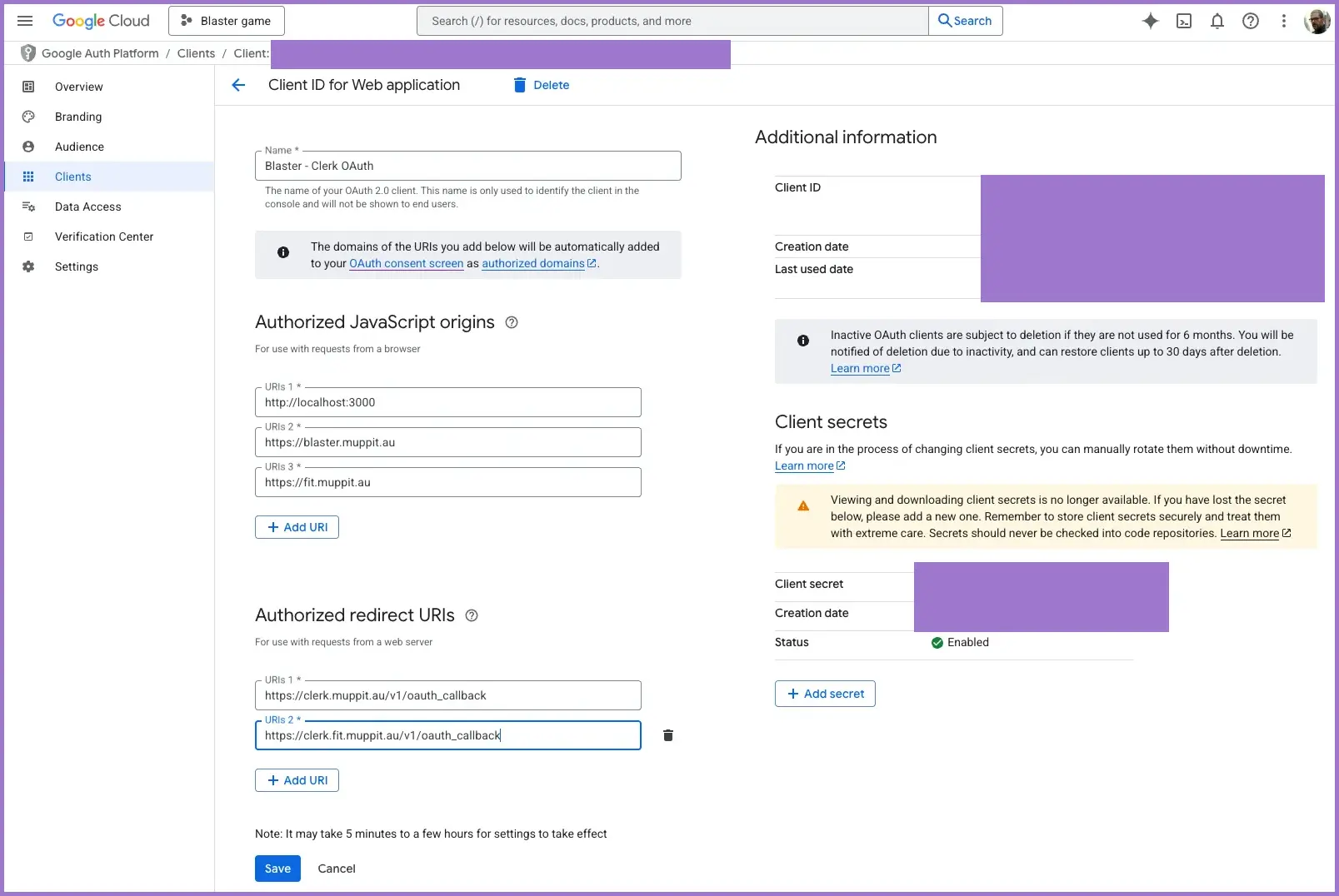 - Regenerate the client in Google Cloud if needed and update Clerk.