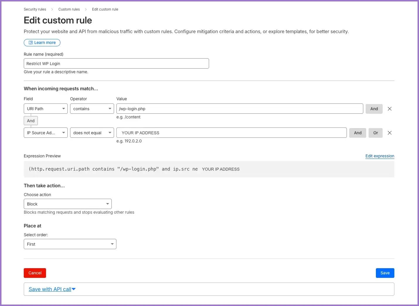 Add a custom rule under Cloudflare Security rules → Custom rules to protect wp-login.php and /wp-admin.